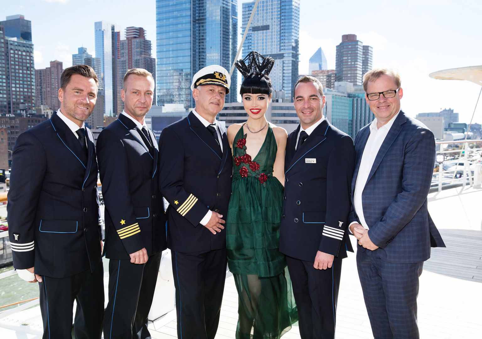 v.l.n.r. Entertainment Manager Kris Broderick, Staff Kapitän Daniel Müller, Kapitän Thomas May, Jessica Minh Anh, General Manager Thomas Knoch, Vice President Communication & Sustainability Hansjörg Kunze. Foto: JMM Paris