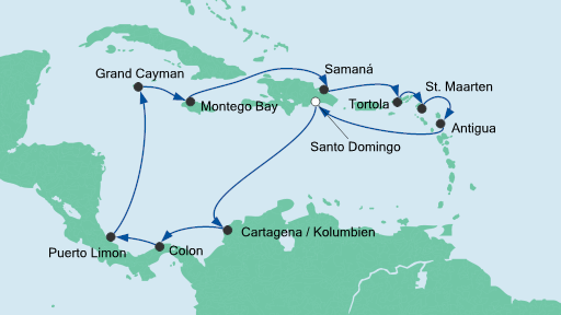 Häfen dieser Route ab Santo Domingo, Cartagena/Kolumbien, Colon, Puerto Limon, Grand Cayman, Montego Bay, Samaná, Tortola, St. Maarten, Antigua, Santo Domingo. Karte: AIDA Cruises
