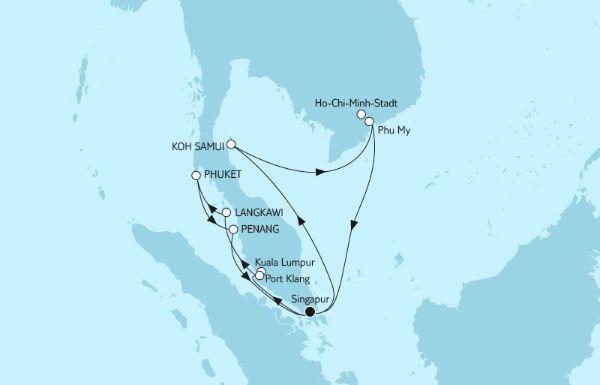 Hier könnt ihr die Routen Asien mit Vietnam und Asien mit Malaysia kombinieren und auf einer 14-tägigen Kreuzfahrt durch Asien eine gelungene Mischung von tropischen Küsten und Stränden sowie exotischen Metropolen erleben! Singapur, Kuala Lumpur und Hoh-Chi-Minh-Stadt bieten euch abwechslungsreiche Sehenswürdigkeiten. Auf den Inseln Langkawi, Phuket und Koh Samui könnt ihr euch auf paradiesische Strände freuen. Hier sammelt ihr vielfältige Eindrücke von Land und Leute auf der Asien-Kreuzfahrten mit der Mein Schiff 1.
