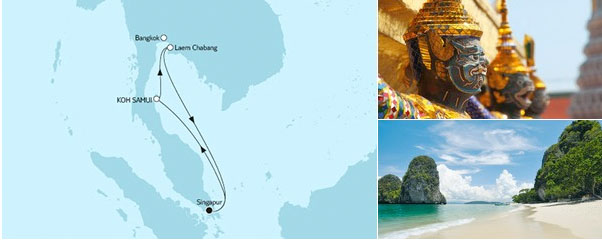Ihr könnt Euch auf der Asien-Kreuzfahrt mit Thailand von der thailändischen Gastfreundschaft verzaubern lassen. In Singapur genießt Ihr einen Tag voller Eindrücke, bevor ihr an Bord der Mein Schiff 1 in Richtung Thailand aufbrechen. Auf Koh Samui im Golf von Thailand, könnt Ihr einen traumhaften Strandtag verbringen. Tags darauf erreicht Ihr Laem Chabang unweit der thailändischen Hauptstadt Bangkok. Es gibt viel zu entdecken – ob Königspalast, wunderschöne Tempelanlagen, zahlreiche Kanäle, schwimmende Märkte oder das pulsierende Straßenleben! Nach zwei aufregenden Tagen in Bangkok genießt Ihr zwei abschließende Wohlfühltage auf dieser Kreuzfahrt in Asien.