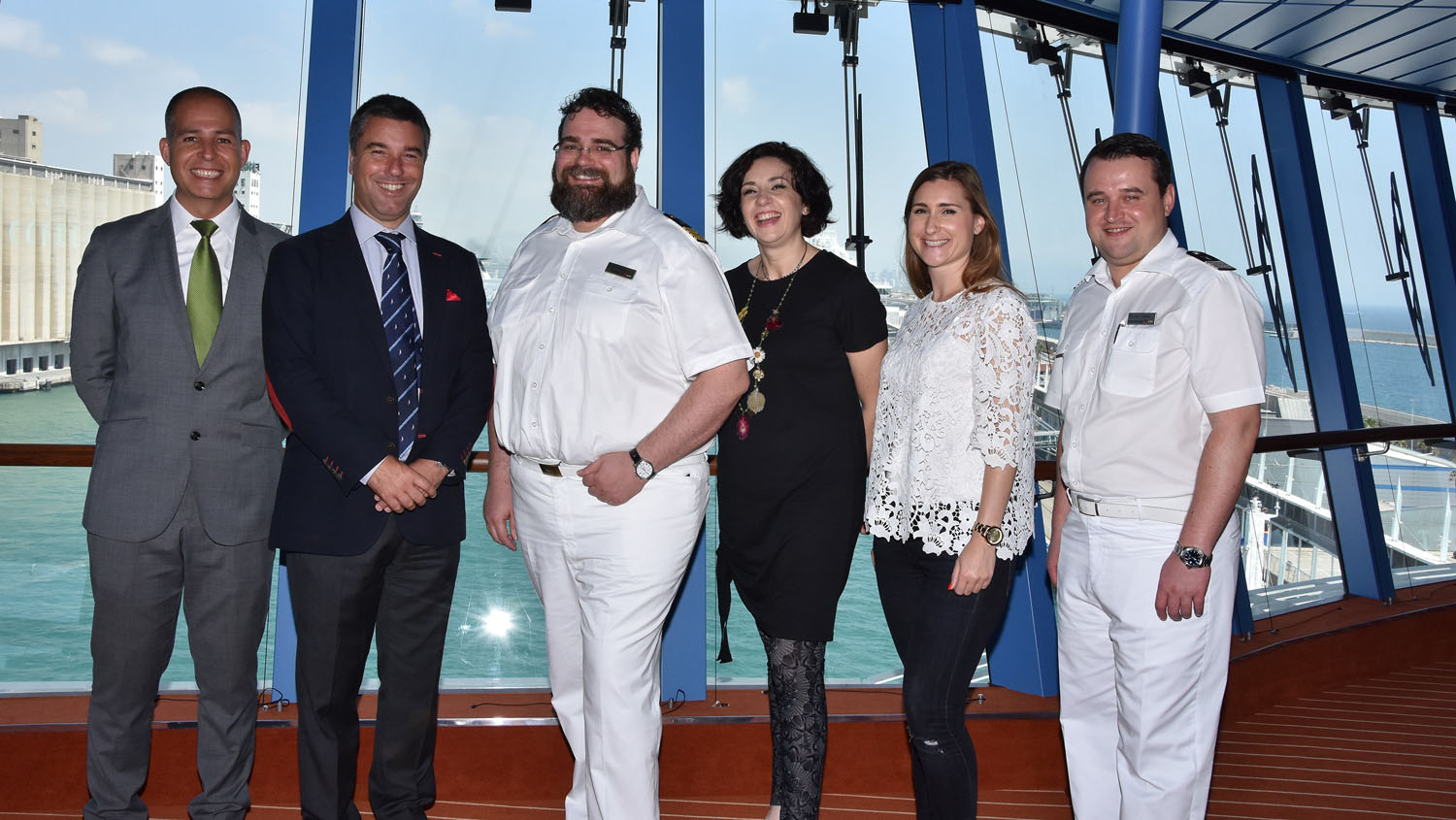 Plakettenübergabe an Bord der AIDAperla. Auf dem Bild: Vertreter der Stadt und des Hafens Barcelona gemeinsam mit Kapitän Boris Becker (mittig) und General Manager AIDAperla Nicolas Goelen (ganz rechts). Foto: AIDA Cruises