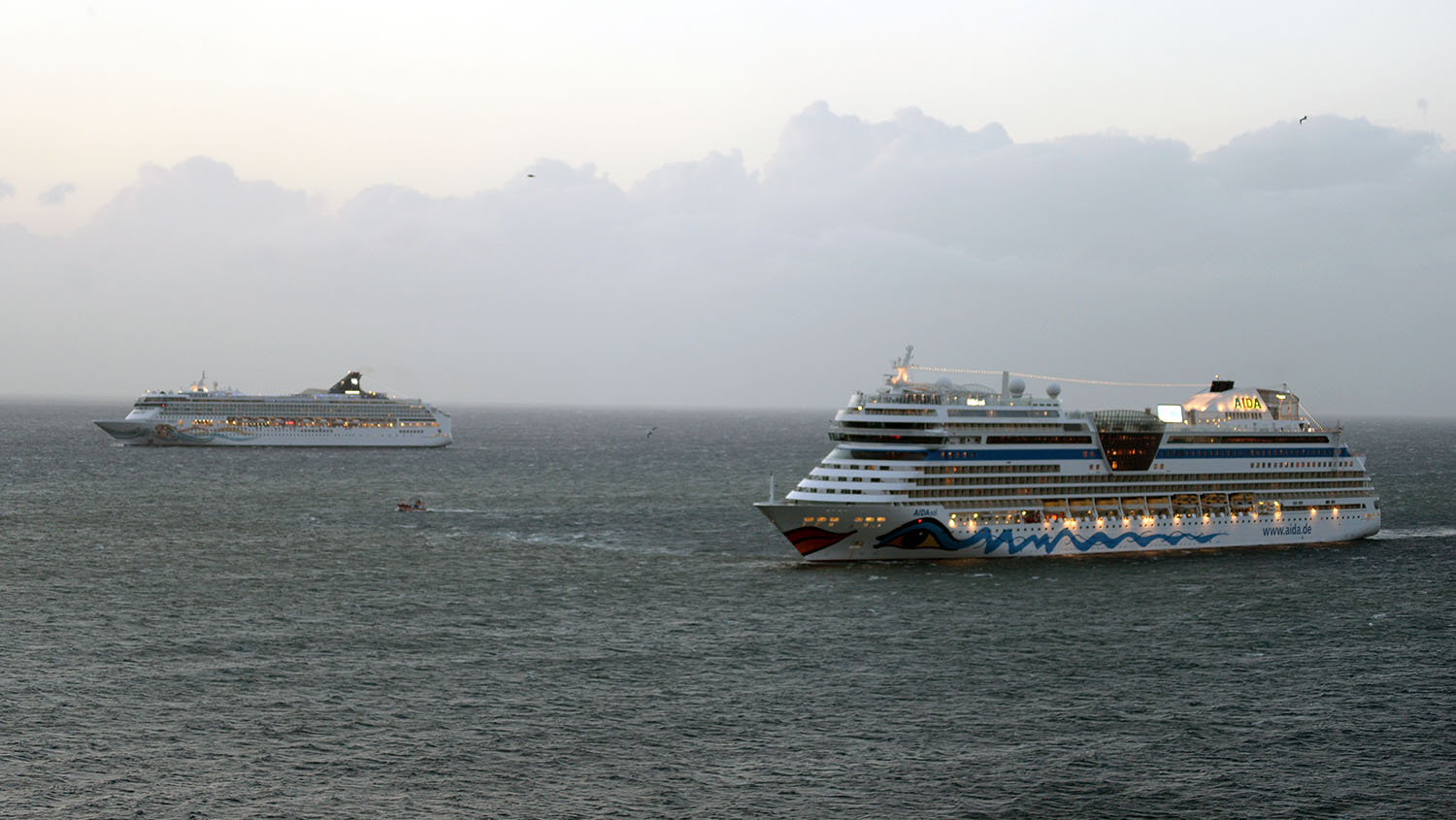 Während AIDAprima den Hafen nicht verlassen kann, kommt die AIDAsol und die Norwegian Spirit nicht in den Hafen. Beide Schiffe liegen vor der Hafeneinfahrt.