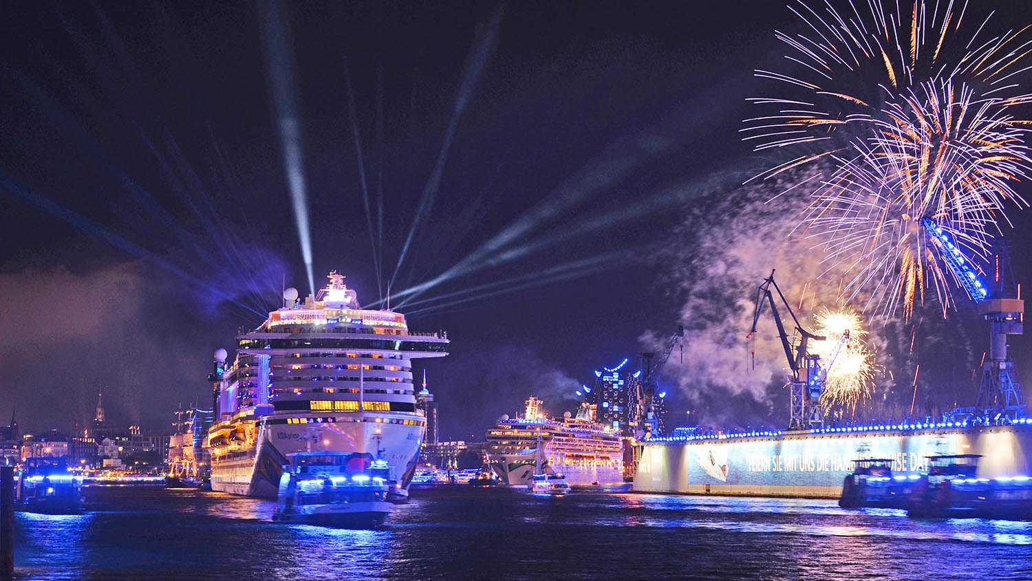 Bei Sonnenschein und schönster Hafenatmosphäre fanden bereits die Manöver auf der Elbe zur Paradenaufstellung begeisterte Zuschauer und um 21.15 Uhr war es soweit: Die Formation stand, und die Parade setzte sich in Bewegung. Begleitet von Barkassen, Seglern und Fahrgastschiffen zogen AIDAprima, Norwegian Jade, Europa2 , Europa und MSC Preziosa die Elbe abwärts durch den blau illuminierten Hafen des Blue Port Hamburg. Jedes Schiff wurde mit einem individuellen Feuerwerk verabschiedet, dass mit stimmungsvoller Musik untermalt und durch den Schauspieler Marek Erhardt moderiert wurde.