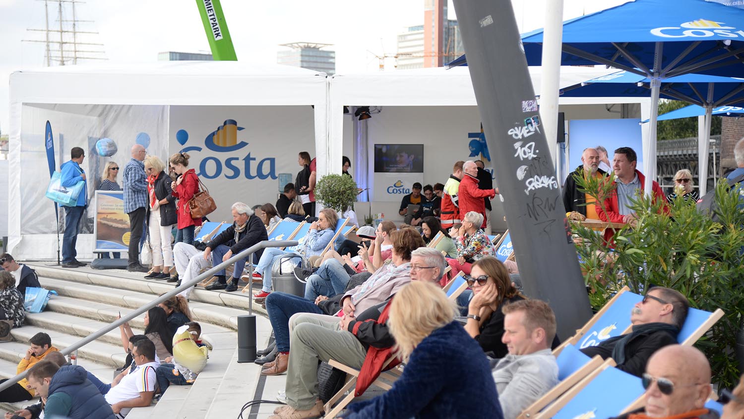 Um punkt 15 Uhr öffnete dann an den Hamburger Hafenmeilen die Festzelte. Neben regionaler Köstlichkeiten wie etwa Labskaus oder einem typisch norddeutschen Pilsener, informierten die Kreuzfahrtunternehmen über ihre Produkte. Noch vor Beginn des größten Kreuzfahrtparade der Welt gaben AIDA und TUI Cruises zahlreiche Neuigkeiten ihrer Schiffe bekannt (wir berichteten AIDAnova und Mein Schiff 1).