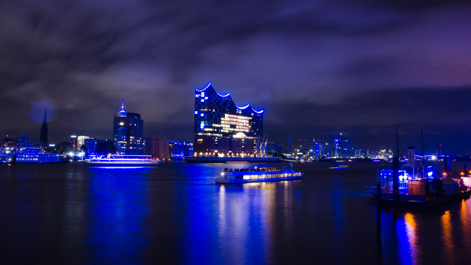 Kurz vorm Feuerwerk am Freitag erleuchtet der Hafen bei langsam besseren Wetter blau. Foto: bergeest