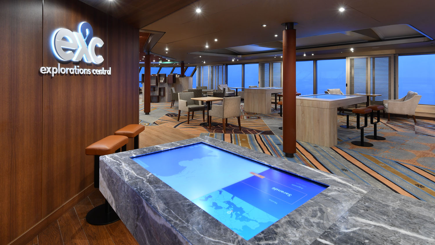 Das EXC wird die Passagiere noch besser auf ihren Landgang vorbereiten und dazu eine Vielzahl von Angeboten bereithalten. Dazu wurde auf dem SChiff das bisherige Crow’s Nest umgebaut, um einen neuen Ort für die Gäste zu schaffen. Hier finden sich nun interaktive Bildschirme und eine virtuelle Brücke. Hier werden in Echtzeit Daten von der tatsächlichen Brücke des Schiffes übertragen und so ein ganz besonderes Kreuzfahrterlebnis von einem einzigartigen Aussichtspunkt geboten. Damit bietet sich eine komplett neue Möglichkeit zur Einstimmung auf das nächste Ziel.