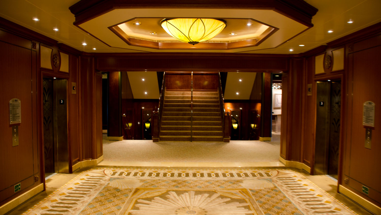 Auf Deck 3 befinden sich die obere Ebene des Britannia Restaurants und eine Vielzahl von Shops. Auffallend sich die hochwertigen Teppiche auf dem Boden der öffentlichen Bereiche, die in jedem Bereich ihrer Umgebung angepasst sind. Über den Kabinendecks auf Deck 9 befinden sich viele weitere öffentliche Räume, wie das zur Mittagszeit beliebte Lido-Restaurant und verschiedene Pools im Außenbereich. Ganz oben auf Deck 11 findet sich auch der exklusive Suitenbereich für die Gäste vom Princess Grill und Queens Grill mit einem wunderschönen Courtyard.