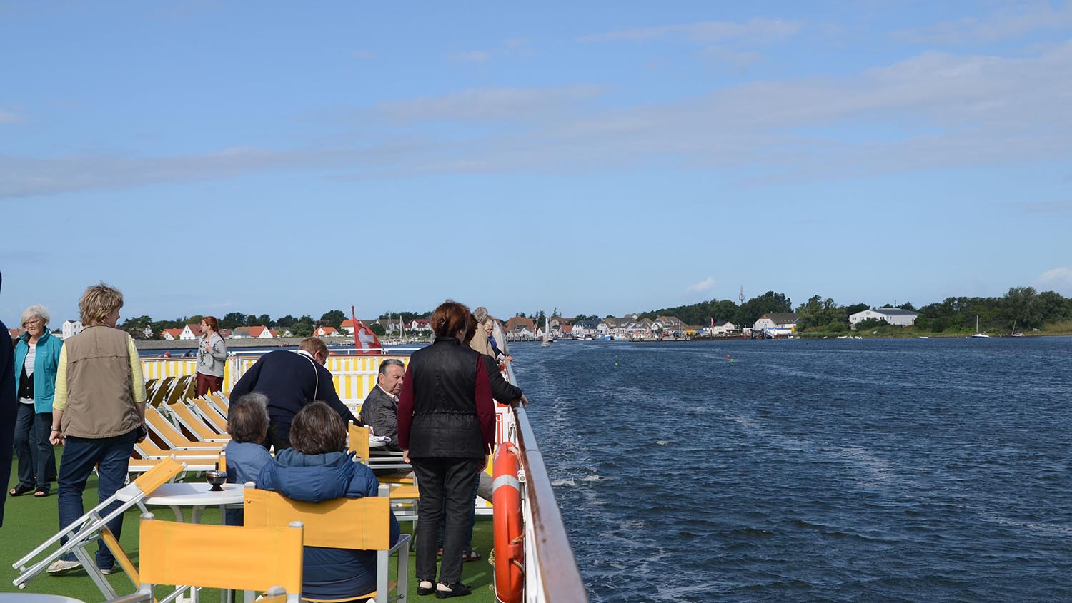 Zurück auf der Katharina von Bora gibt es erst einmal das Mittagessen, während die Katharina von Bora über den Nachmittag nach Greifswald zurück ans Festland fährt. Viele Reisende verzichten heute auf das gesetzte Essen und verkürzen die Essenszeit beim sogenannten Light Lunch, einem Buffet im Panoramasalon des Schiffes. Die gewonnene Zeit wird für ein ausgiebiges Sonnenbad auf dem Sonnendeck genutzt. Bei strahlendem Sonnenschein und ruhiger See vergeht die erste längere Schiffspassage der Reise wie im Fluge.