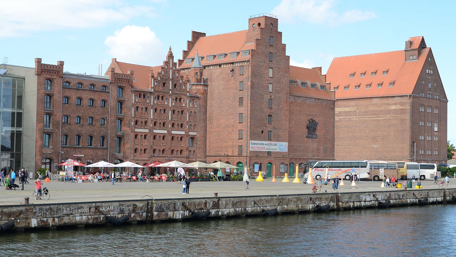 Noch einmal geht es zurück in die Hansestadt Stralsund. Bereits am Abend nach der Einschiffung gab es für die Gäste des Flussliners die Möglichkeit, die Geschichte der ehemaligen Handelsmetropole bei einem historischen Rundgang zu erlaufen. Geführt von einer Händlerin der Hanse und des preußischen Husarenoffiziers Ferdinand von Schill, zweier Gästeführer in historischem Gewand, ging es hinein in die Altstadt von Stralsund. Seit 2002 steht sie in der Welterbeliste der UNESCO. Besucher der Stadt können sich in den engen Gassen der Stadt und den Fassaden der stattlichen Bürgerhäuser von der einstigen Blüte Stralsunds überzeugen.