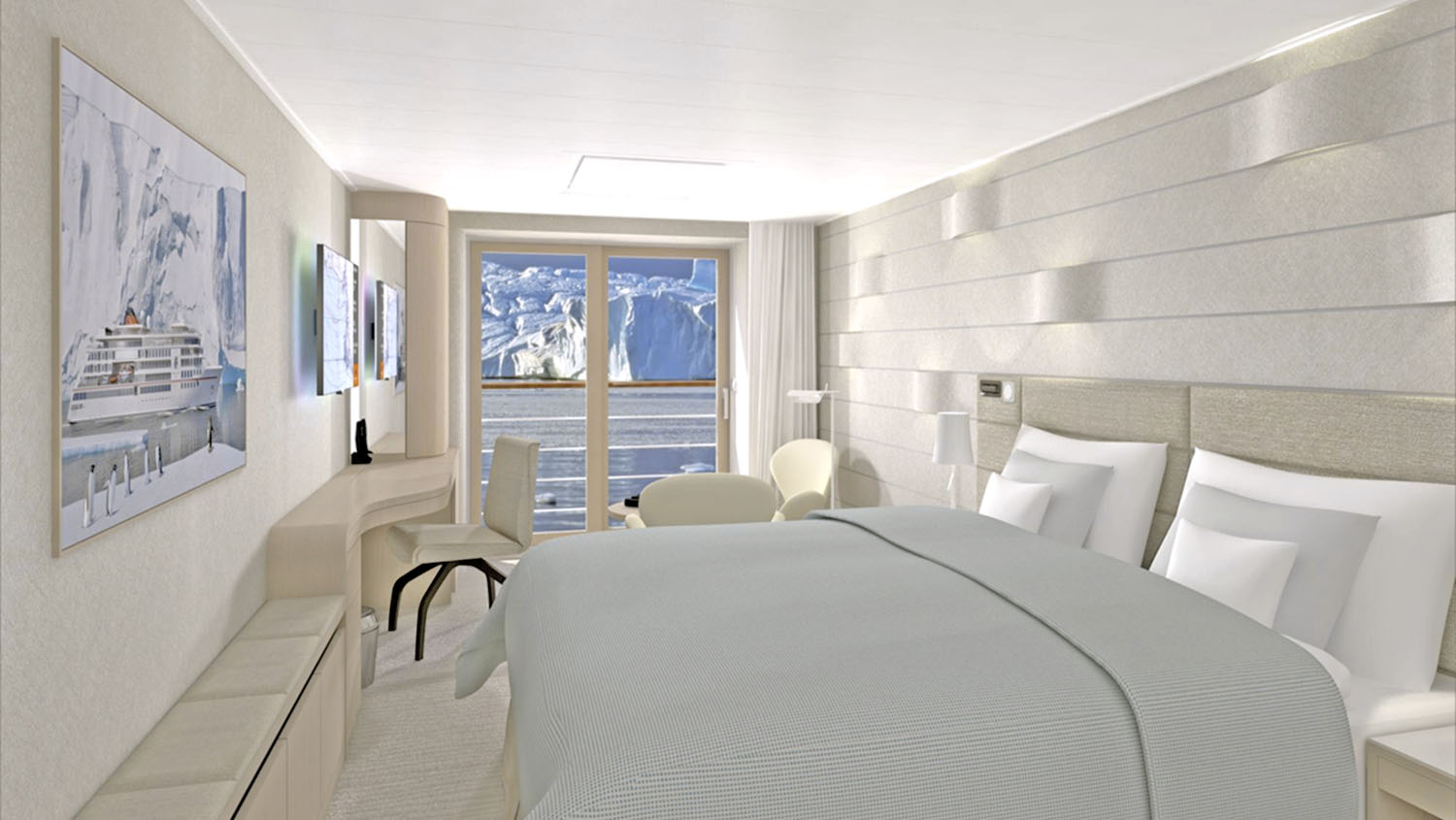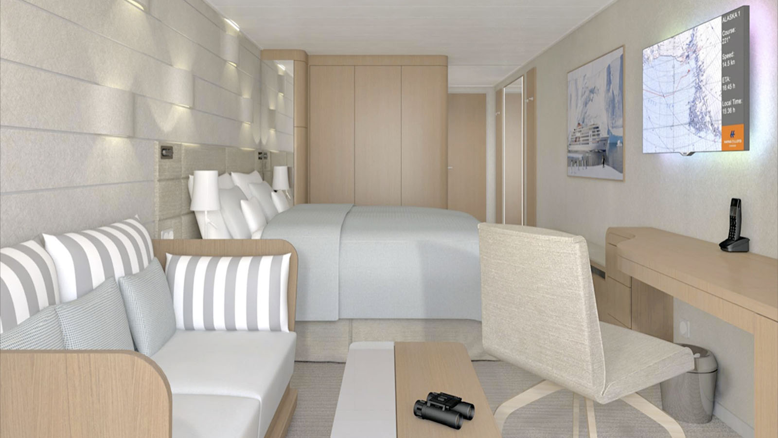 Neben 8 Kabinen mit Panoramafenster und 20 Kabinen mit französischen Balkon (je ca. 22 m2) wird es 63 Balkon Kabinen mit einer Größe von 22 m2 und einen 6 m2 großen Balkon an Bord geben. Die 14 Junior Suiten verfügen über 43 m2 Wohnraum und einen 6 m2 großen Balkon, die 4 Grand Suiten werden 55 m2 Wohnfläche und 16 m2 Balkonfläche bieten. Zehn 22 m2 große Kabinen werden reine Fensterkabinen sein und eine 37m2 große Kabine wird für Menschen mit Behinderung vorgehalten. Alle Kabinen werden in hellen Farben gehalten und bieten neben einem großen Bett eine Sitzgelegenheit und einen kleinen Schreibtisch. Besonders schön und gut durchdacht ist die Sitzbank vor dem Bett mit Ablagefläche, hier lässt sich besonders einfach Expeditionskleidung anlegen.