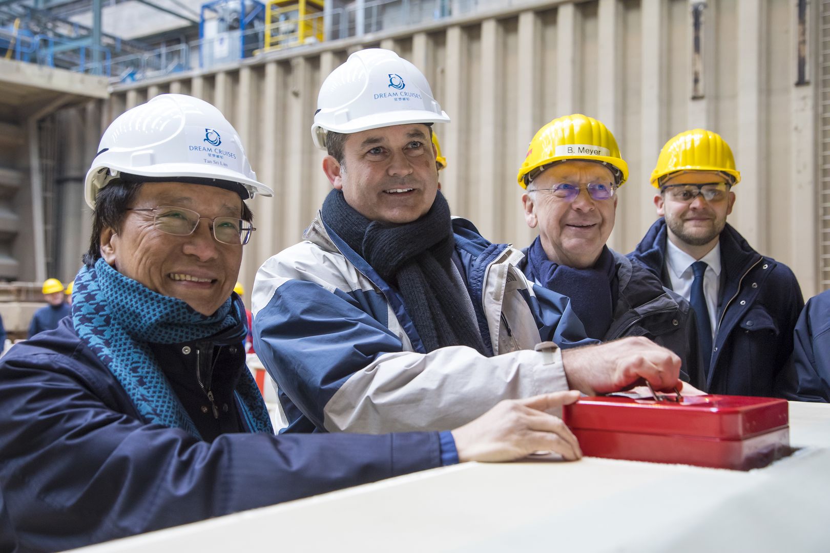 (pm) Am 10. Januar 2017 wurde auf der Meyer Werft das Kreuzfahrtschiff World Dream mit der Baunummer S.712 im überdachten Baudock II auf Kiel gelegt. Tan Sri Lim Kok Thay, Chairman und Vorstandsvorsitzender von Genting Hong Kong, legte zusammen mit Bernard Meyer, Tim Meyer (Geschäftsführer Meyer Werft) und Thatcher Brown, President Dream Cruises den Glückscent auf die Pallungen, bevor der 800-Tonnen-Kran den ersten Block des zweiten Bauabschnittes für das neue Schiff absetzte. Der erste Bauabschnitt wurde bereits ausgedockt. „Wir sind sehr froh, dass unser zweiter Neubau für unsere neue Marke Dream Cruises nun Konturen erhält. Das Schiff wird viele Besonderheiten für den asiatischen Markt bereithalten“ so Tan Sri Lim.