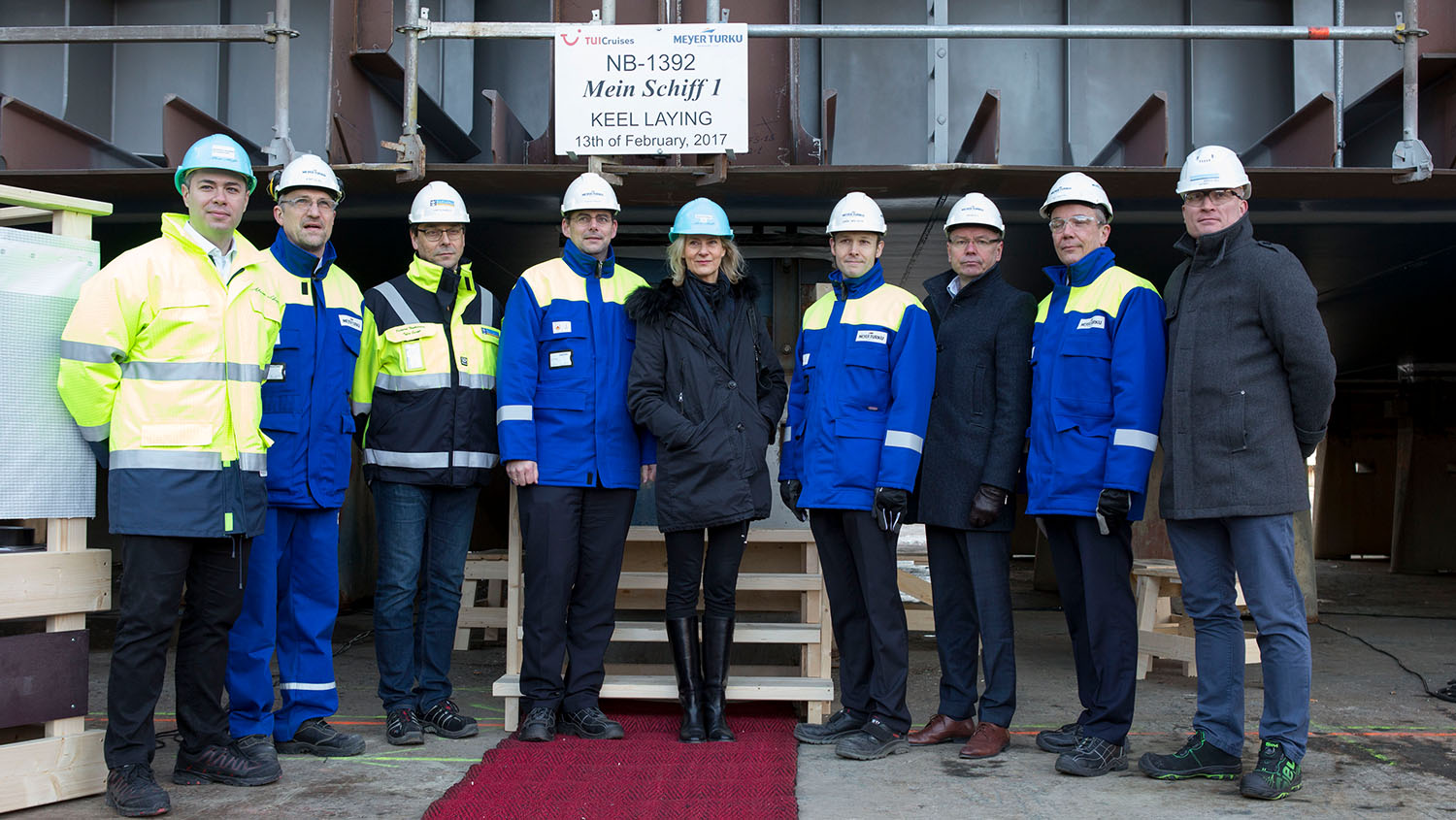 (al) Helm auf und alle in Reihe zum Fototermin aufstellen. Einmal mehr traf sich TUI Cruises CEO, Wybcke Meier, im finnischen Turku zum obligatorischen Gruppenfoto mit Schiffsbauern und Werftvertretern. Denn heute startete für TUI Cruises sozusagen in eine neue Zeitrechnung. Mit der Kiellegung der neuen Mein Schiff 1 und dem offiziellen Brennstart für die neue Mein Schiff 2 ist die Wohlfühlflotte erst einmal komplett. Beide Schiffe werden rund 20 Meter länger sein als die bereits in Dienst gestellten Neubauten der Reederei. Das letzte Schiff der älteren Generation wird am 2. Juni 2017 in Hamburg getauft. (wir berichteten)