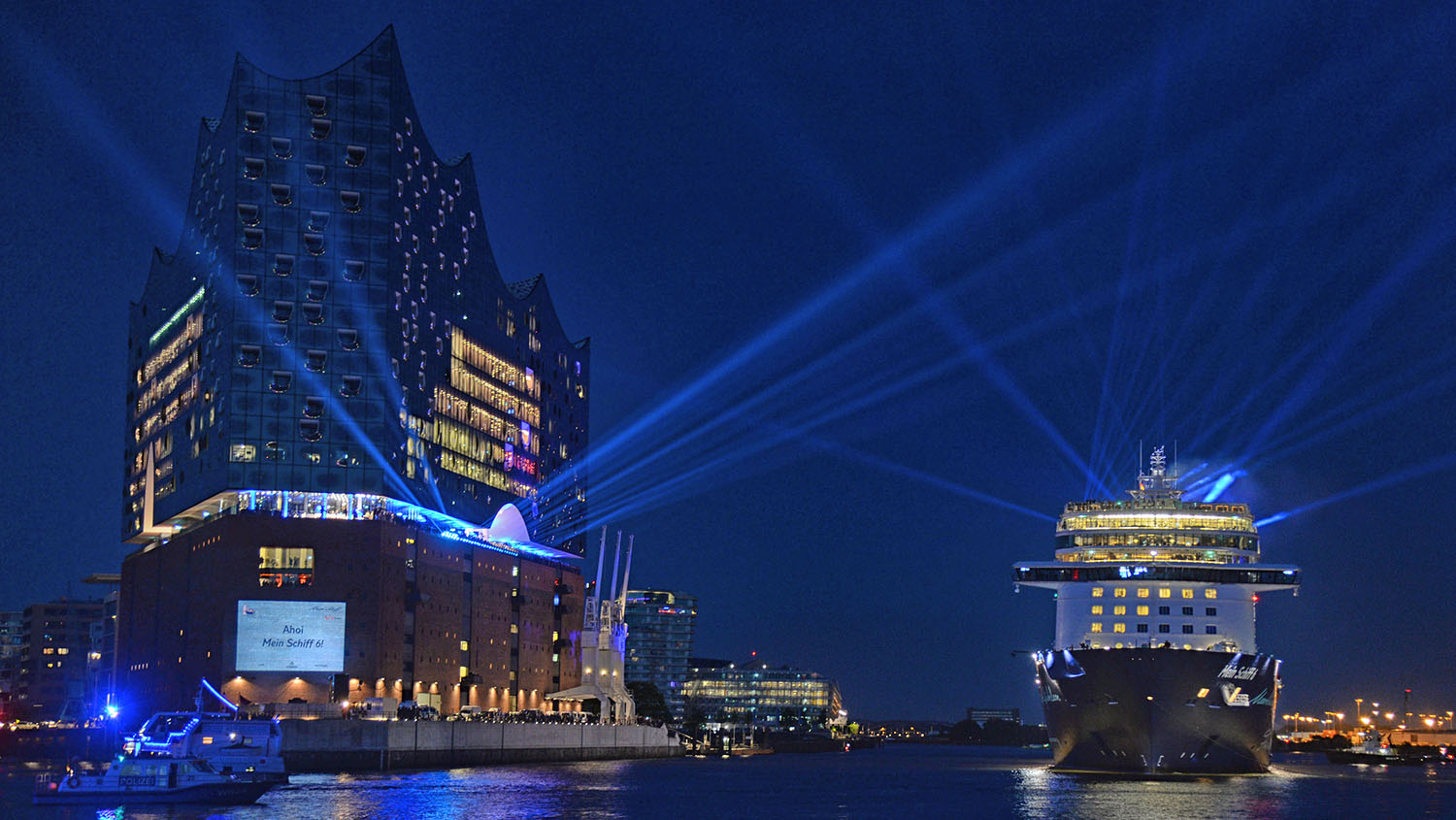 Eine beeindruckende Lichtinszenierung hatte TUI Cruises im Vorfeld versprochen. Letztlich waren es nur ein paar Strahler die zwischen Elbphilharmonie und Mein Schiff 6 hin und her schwenkten, dazu ein Lichterteppich an der Elbphilharmonie und eine Lichtprojektion „Ahoi Mein Schiff 6“ am Eck des Wahrzeichens. Wer dafür in den Hafen kam wurde enttäuscht.
