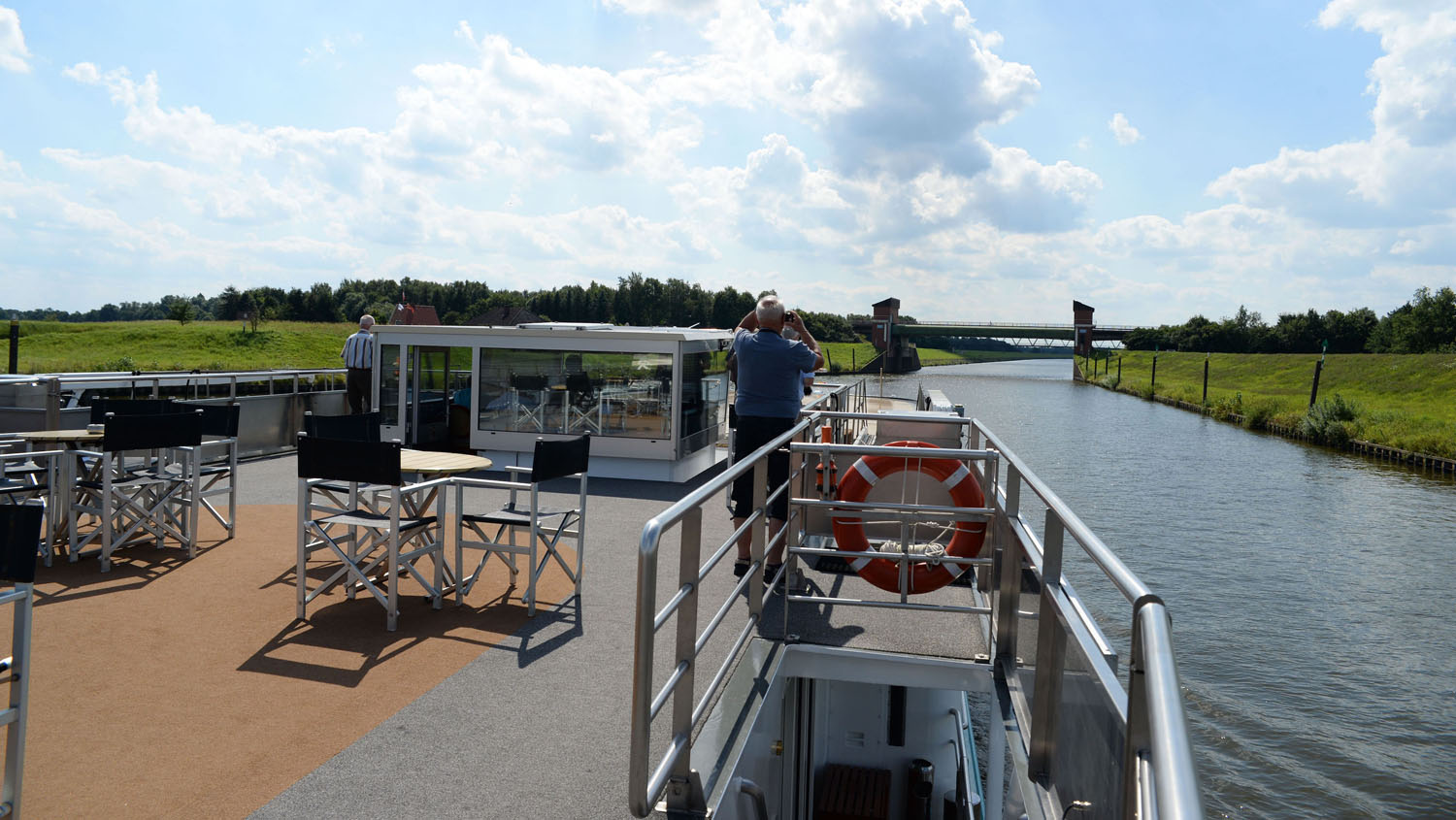 Das Tor schließt sich und langsam setzt sich er überdemensionierte Fahrstuhl mit einem kurzen und leichten Ruck in Bewegung. Für einen kurzen Moment kann man eine Stecknadel fallen hören, zu beeindruckend ist die Technik, dann klicken die Kameras. Passagiere laufen auf dem Deck herum, jedes Detail will als Urlaubserinnerung verewigt sein. In nur drei Minuten sind die 38 Meter Höhenunterschied überwunden. Tief unter der Saxonia liegt nun der eben noch befahrende nördliche Teil des Elbe-Seiten-Kanals. Über das Ende des Schiffes lässt sich ein Blick in die Tiefe erhaschen, während sich vorne die Fahrstuhlklappe öffnet und der Flussliner wieder herausgleitet.