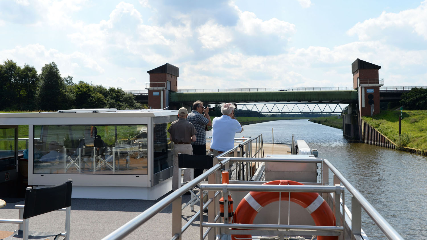 Das Tor schließt sich und langsam setzt sich er überdemensionierte Fahrstuhl mit einem kurzen und leichten Ruck in Bewegung. Für einen kurzen Moment kann man eine Stecknadel fallen hören, zu beeindruckend ist die Technik, dann klicken die Kameras. Passagiere laufen auf dem Deck herum, jedes Detail will als Urlaubserinnerung verewigt sein. In nur drei Minuten sind die 38 Meter Höhenunterschied überwunden. Tief unter der Saxonia liegt nun der eben noch befahrende nördliche Teil des Elbe-Seiten-Kanals. Über das Ende des Schiffes lässt sich ein Blick in die Tiefe erhaschen, während sich vorne die Fahrstuhlklappe öffnet und der Flussliner wieder herausgleitet.