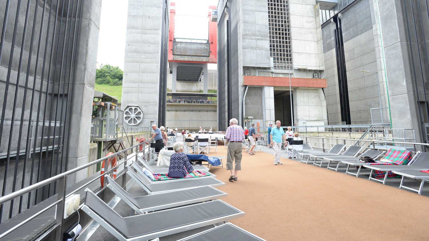 Das Tor schließt sich und langsam setzt sich er überdemensionierte Fahrstuhl mit einem kurzen und leichten Ruck in Bewegung. Für einen kurzen Moment kann man eine Stecknadel fallen hören, zu beeindruckend ist die Technik, dann klicken die Kameras. Passagiere laufen auf dem Deck herum, jedes Detail will als Urlaubserinnerung verewigt sein. In nur drei Minuten sind die 38 Meter Höhenunterschied überwunden. Tief unter der Saxonia liegt nun der eben noch befahrende nördliche Teil des Elbe-Seiten-Kanals. Über das Ende des Schiffes lässt sich ein Blick in die Tiefe erhaschen, während sich vorne die Fahrstuhlklappe öffnet und der Flussliner wieder herausgleitet.