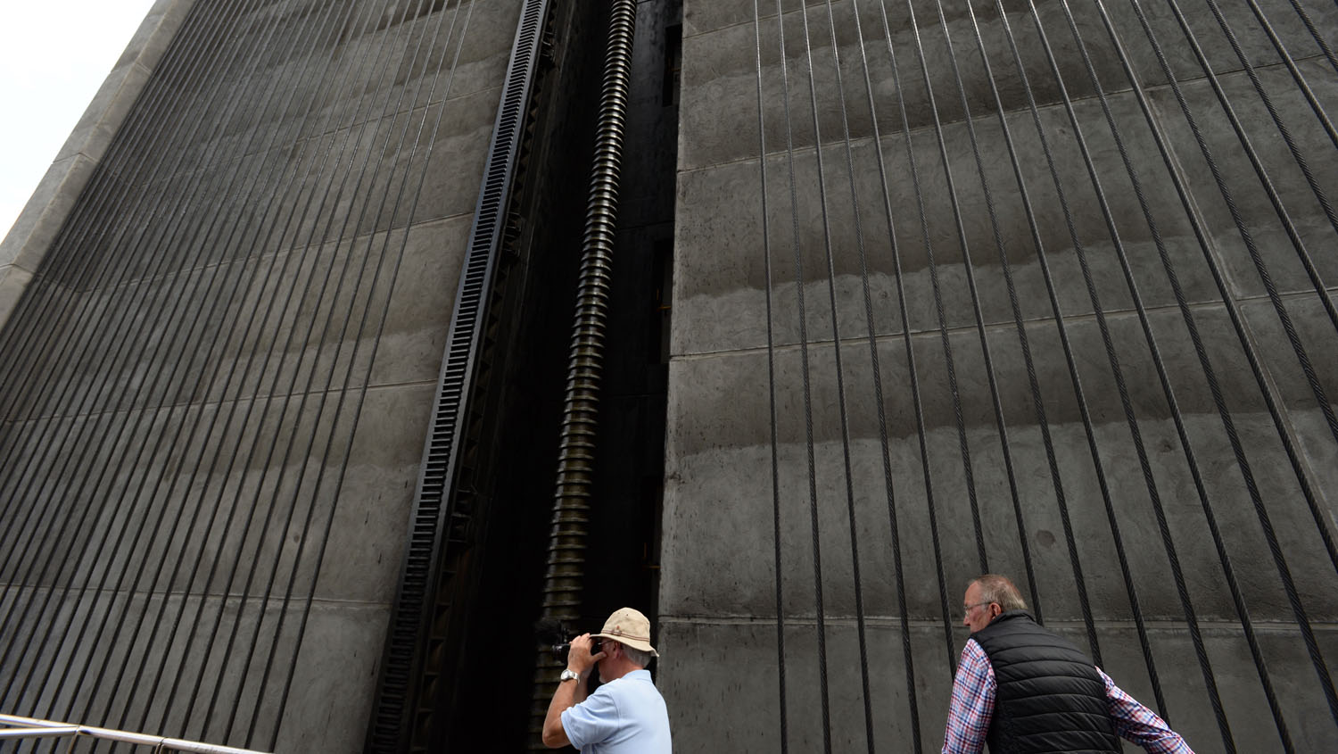 Das Tor schließt sich und langsam setzt sich er überdemensionierte Fahrstuhl mit einem kurzen und leichten Ruck in Bewegung. Für einen kurzen Moment kann man eine Stecknadel fallen hören, zu beeindruckend ist die Technik, dann klicken die Kameras. Passagiere laufen auf dem Deck herum, jedes Detail will als Urlaubserinnerung verewigt sein. In nur drei Minuten sind die 38 Meter Höhenunterschied überwunden. Tief unter der Saxonia liegt nun der eben noch befahrende nördliche Teil des Elbe-Seiten-Kanals. Über das Ende des Schiffes lässt sich ein Blick in die Tiefe erhaschen, während sich vorne die Fahrstuhlklappe öffnet und der Flussliner wieder herausgleitet.