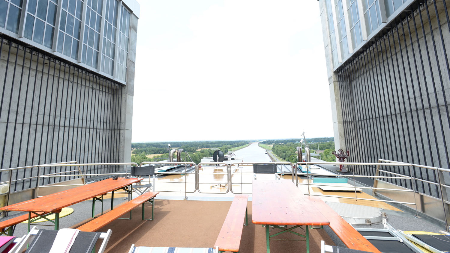 Das Tor schließt sich und langsam setzt sich er überdemensionierte Fahrstuhl mit einem kurzen und leichten Ruck in Bewegung. Für einen kurzen Moment kann man eine Stecknadel fallen hören, zu beeindruckend ist die Technik, dann klicken die Kameras. Passagiere laufen auf dem Deck herum, jedes Detail will als Urlaubserinnerung verewigt sein. In nur drei Minuten sind die 38 Meter Höhenunterschied überwunden. Tief unter der Saxonia liegt nun der eben noch befahrende nördliche Teil des Elbe-Seiten-Kanals. Über das Ende des Schiffes lässt sich ein Blick in die Tiefe erhaschen, während sich vorne die Fahrstuhlklappe öffnet und der Flussliner wieder herausgleitet.