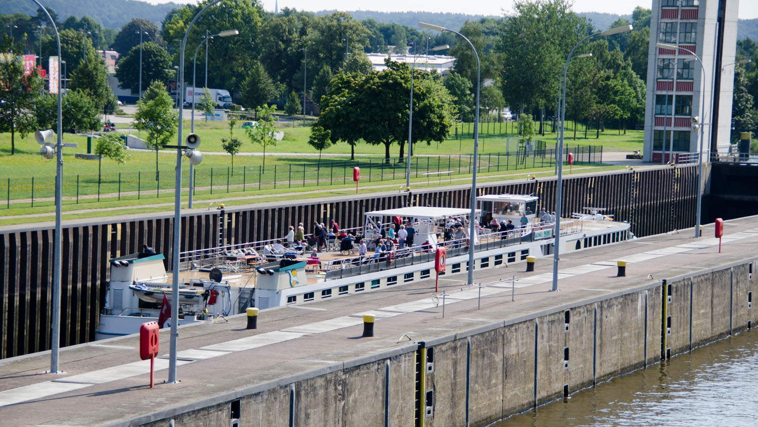 Kurz vor Lauenburgs Elbbrücke dreht die Saxonia in den Elbe-Seiten-Kanal. Nach gut elf Kilometern steht dort dann mitten im Kanal ein riesiger Schiffsfahrstuhl. Langsam nähert sich die Saxonia dem beeindruckendem Bauwerk, dass in steter Regelmäßigkeit Binnenschiffe aufnimmt und ausstößt. Zunächst heißt es aber warten, vor der Saxonia liegt noch ein Schuttgut-Schiff und hier geht alles streng nach Reihenfolge.