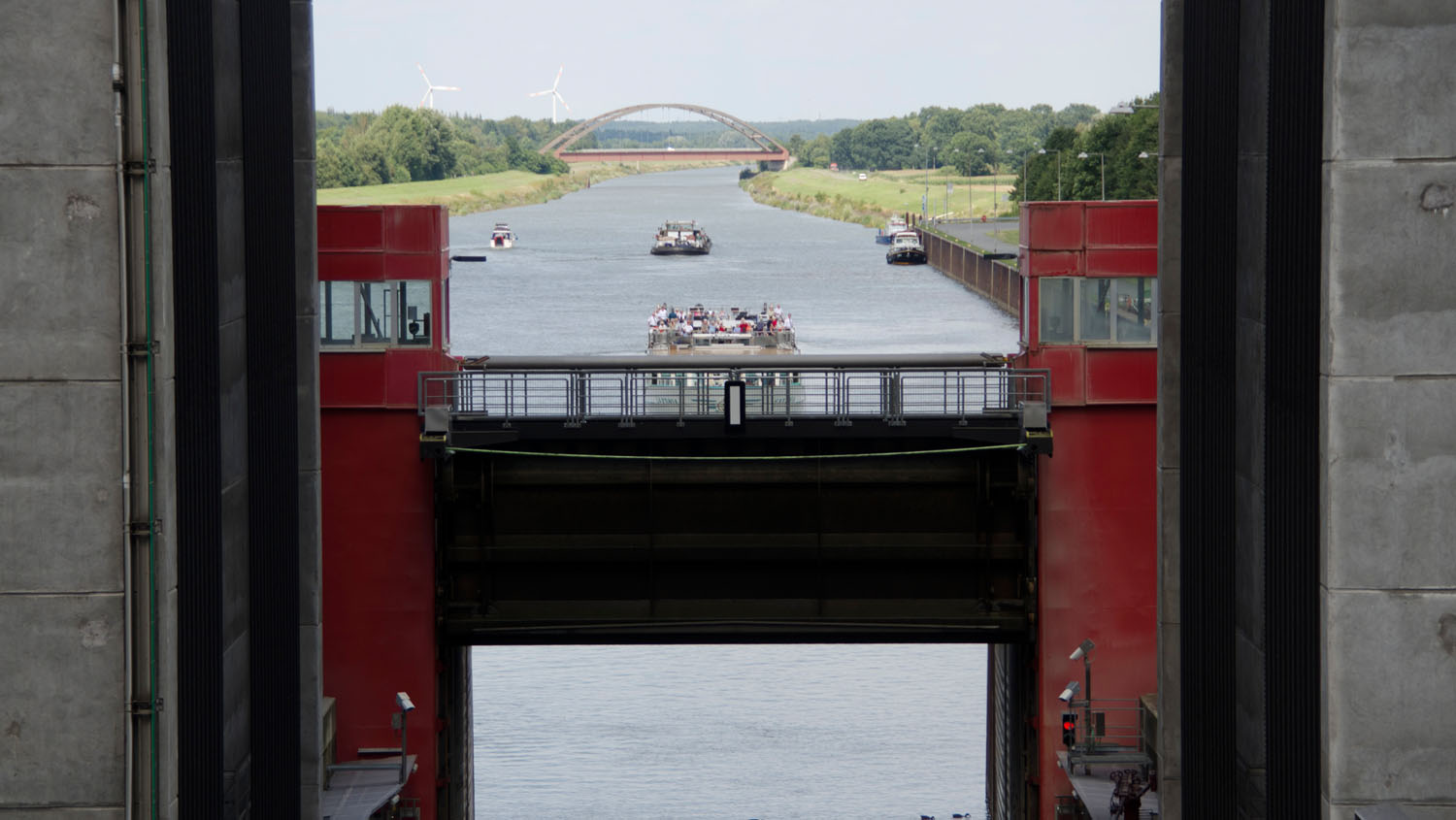 Kurz vor Lauenburgs Elbbrücke dreht die Saxonia in den Elbe-Seiten-Kanal. Nach gut elf Kilometern steht dort dann mitten im Kanal ein riesiger Schiffsfahrstuhl. Langsam nähert sich die Saxonia dem beeindruckendem Bauwerk, dass in steter Regelmäßigkeit Binnenschiffe aufnimmt und ausstößt. Zunächst heißt es aber warten, vor der Saxonia liegt noch ein Schuttgut-Schiff und hier geht alles streng nach Reihenfolge.