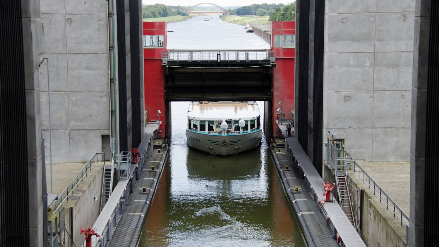 Ein Fahrstuhl im Kanal: auf Flusskreuzfahrten erleben Reisende immer wieder ungewöhnliche Strecken. Wir waren auf der Saxonia von Phoenix Reisen und wurden mit dem Flussliner durch Schiffshebewerk in Scharnebeck gehoben.