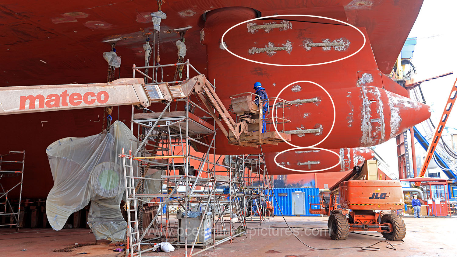 Arbeiten an Azipods und Propellern MS Europa 2 in der Werft. Foto: Oliver Asmussen/oceanliner-pictures.com