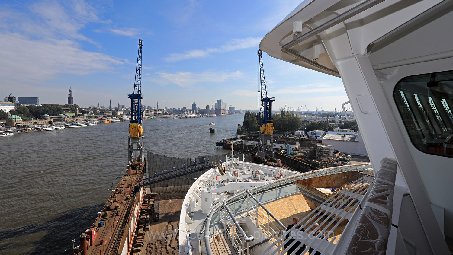 Blick auf Elbphilharmonie und Michel von Brückennock Europa 2. Foto: Oliver Asmussen/oceanliner-pictures.com