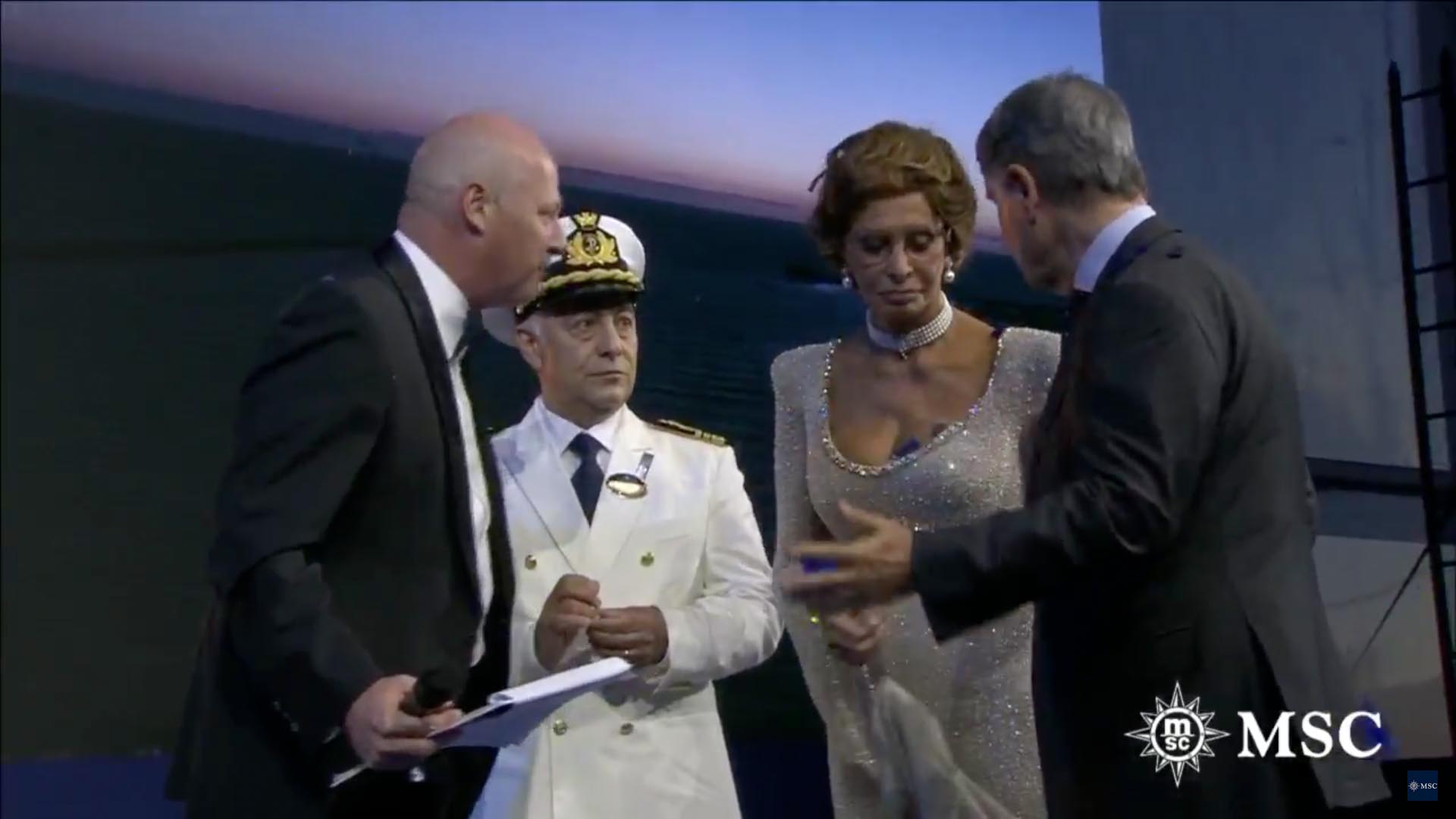 Es war ein nur kurzer Moment, aber dieser war spektakulär. Mit einer goldenen Schere zerschnitt die letzte Diva Sophia Loren das Band an dem die Champagnerflasche hing, welche nur wenig später am Bug des Täuflings zerschellte. Zuvor gab es noch ganz traditionell die Parade der Offiziere und warme sowie glückbringende Worte der Taufpatin. Nun heißt das neue und größte Kreuzfahrtschiff von MSC Kreuzfahrten auch offiziell MSC Meraviglia.