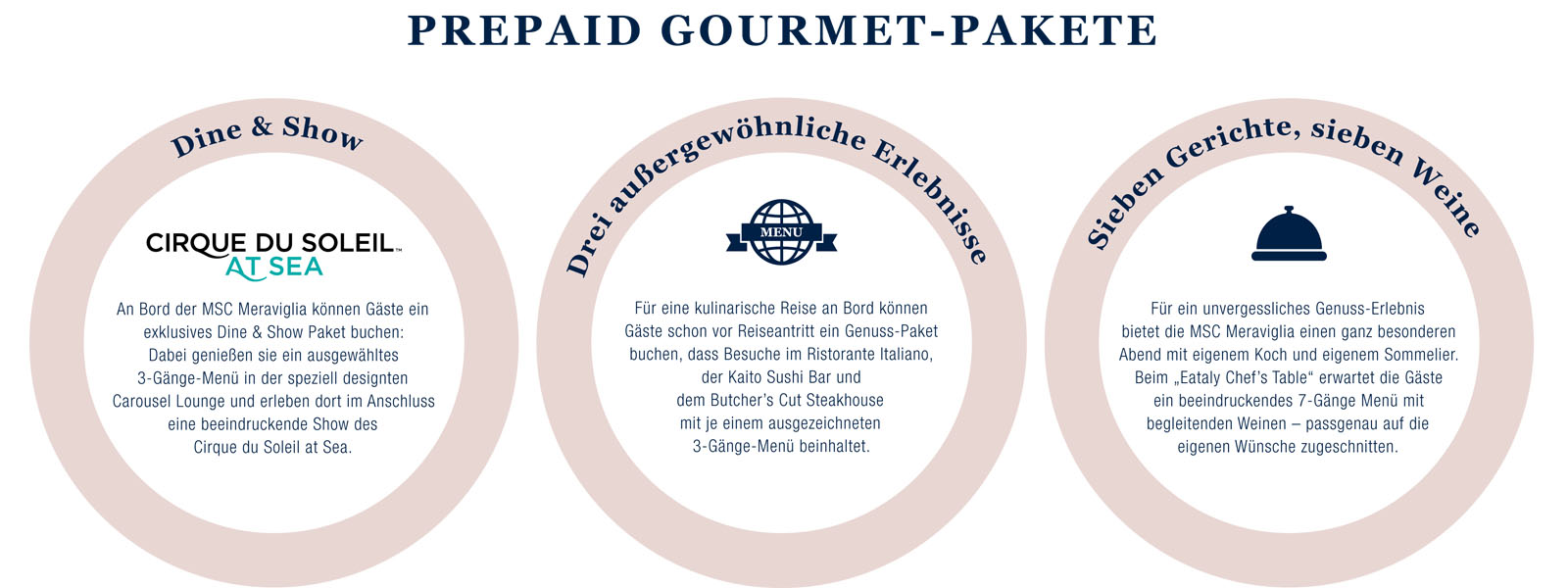 MSC Gäste an Bord der MSC Meraviglia können ein exklusives Dine & Show Paket buchen: Dabei genießen sie in der speziell designten Carousel Lounge ein ausgewähltes Menü und erleben dort im Anschluss eine beeindruckende Show des Cirque du Soleil at Sea. Für Gäste, die jedes Spezialitäten-Restaurant erleben möchten, bietet MSC ein besonderes Gourmetpaket, das mit einem Preisvorteil bereits vor der Reise gebucht werden kann.