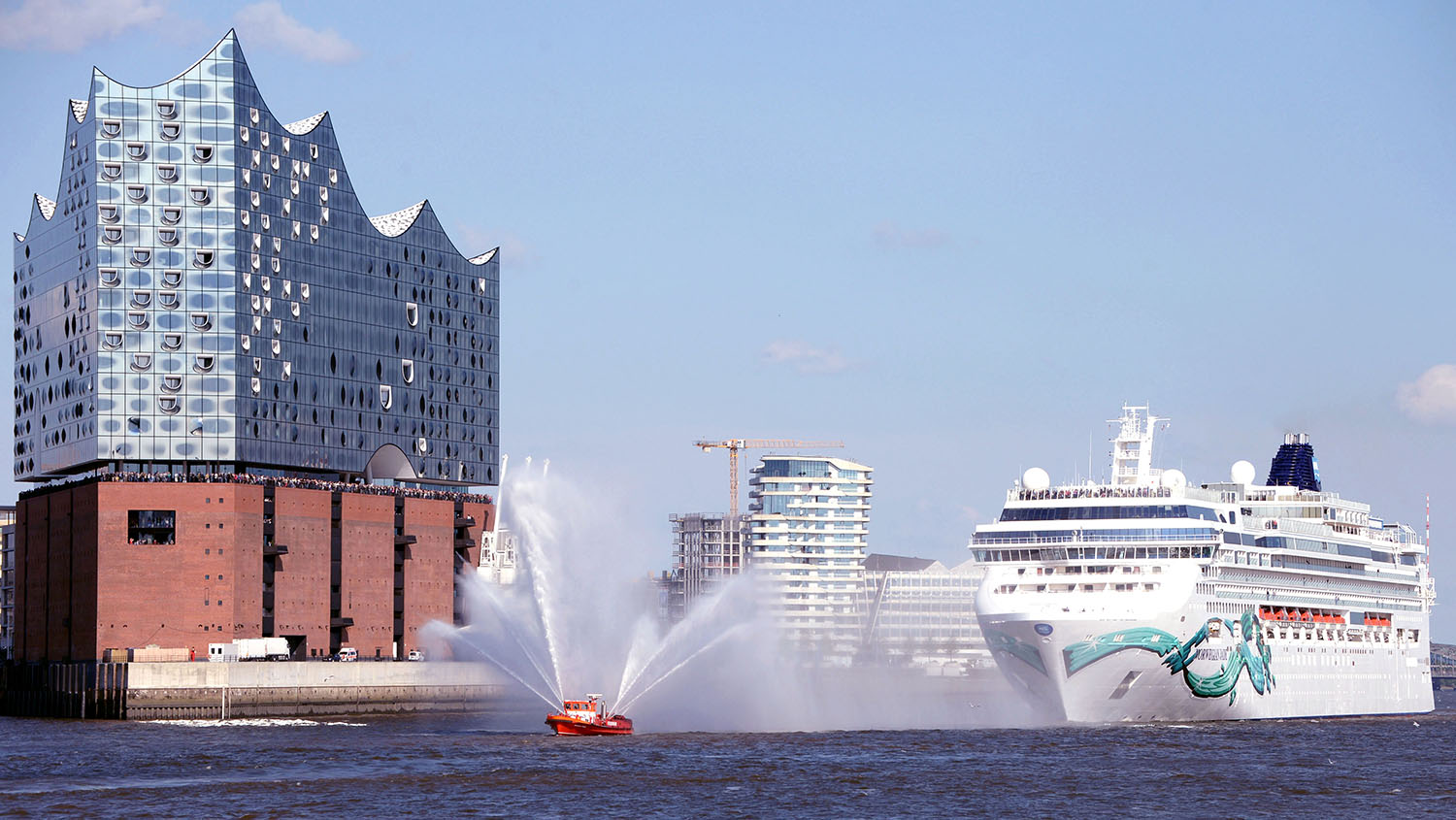 Die Norwegian Jade feierte ihren Erstanlauf in Hamburg vor der Elbphilharmonie. Foto: lenthe/touristik-foto.de