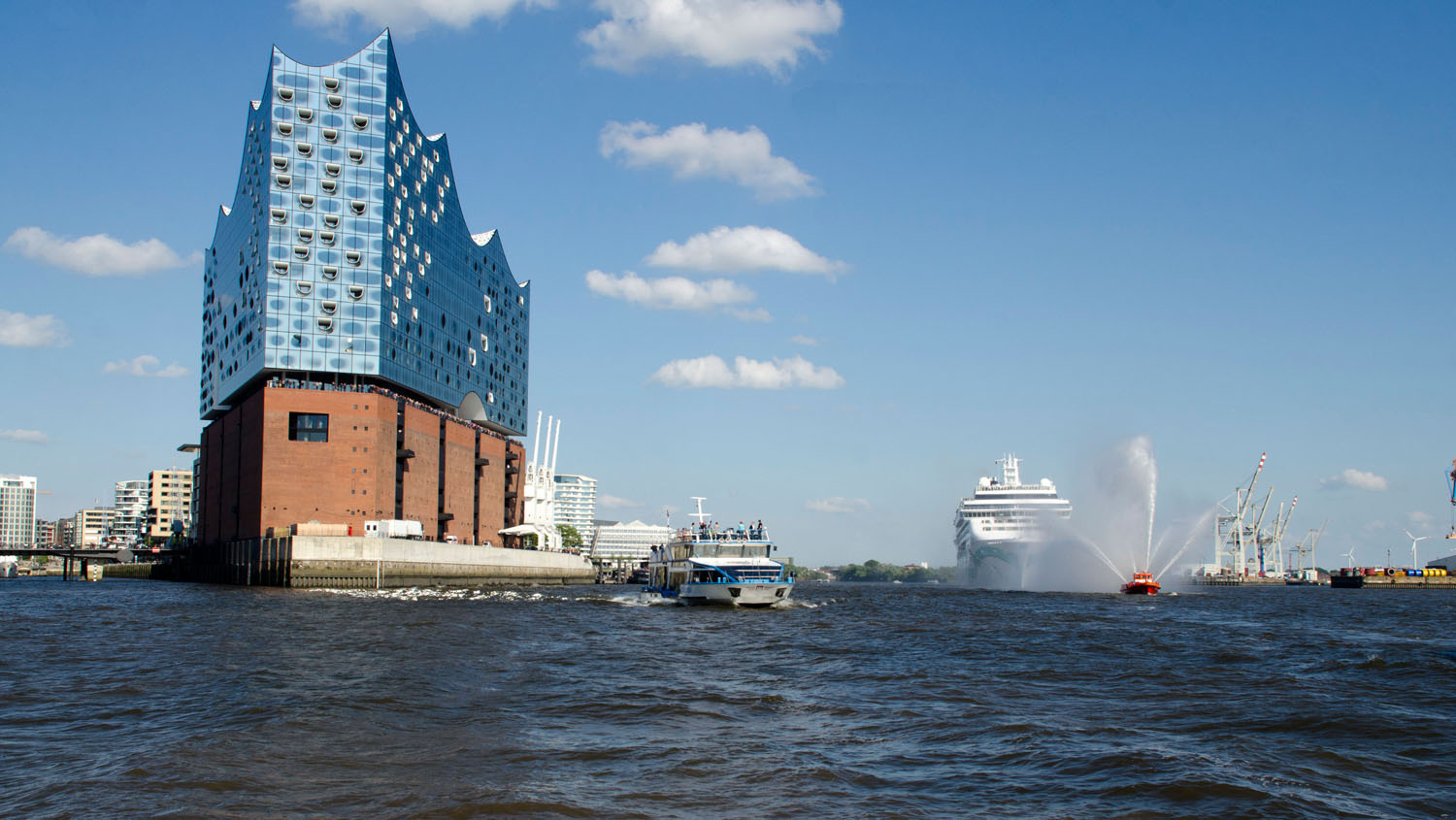 Die Norwegian Jade feierte ihren Erstanlauf in Hamburg vor der Elbphilharmonie. Foto: lenthe/touristik-foto.de