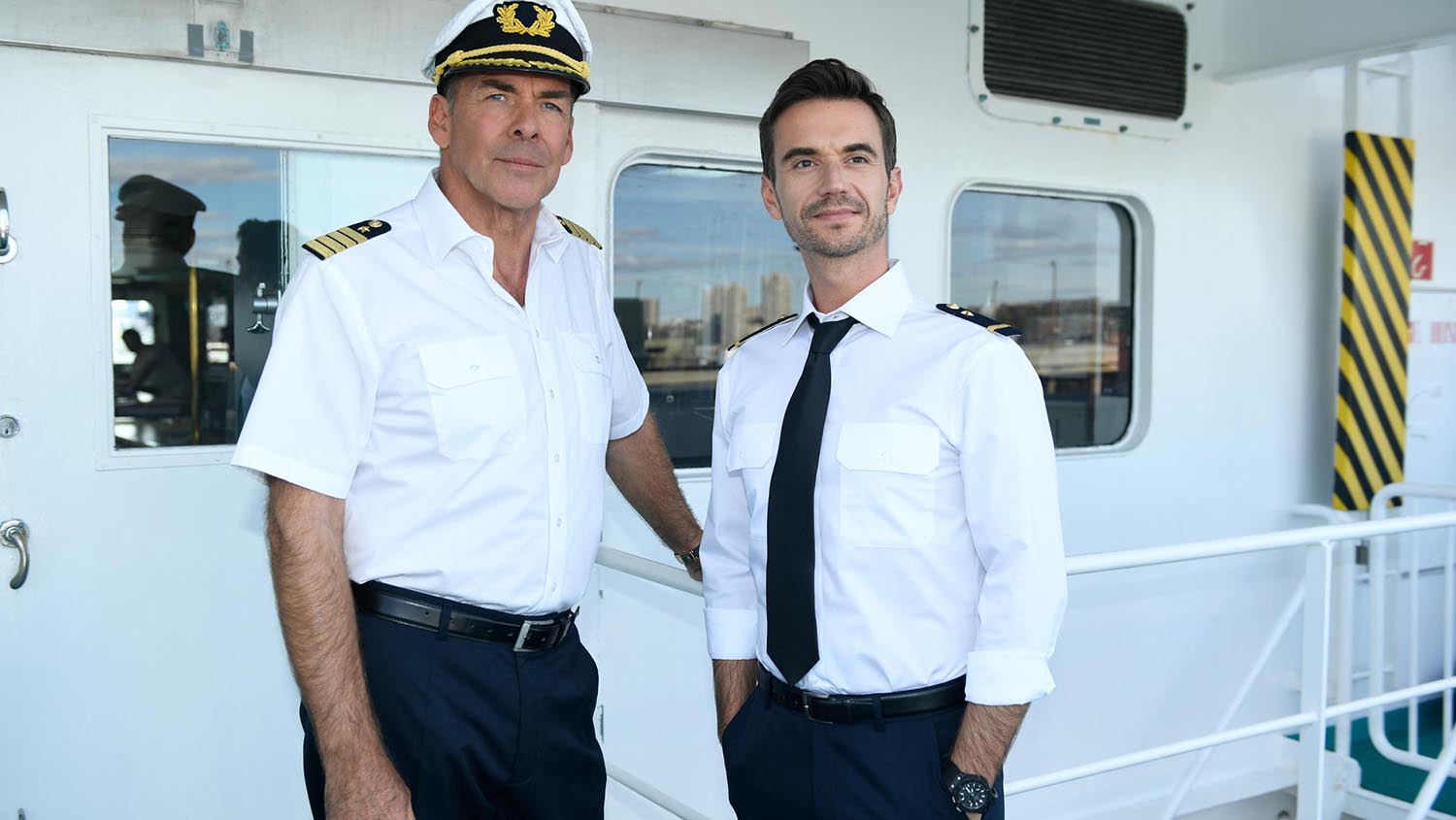 Promipower im Doppelpack: Kapitän Burger (Sascha Hehn, l.) und der junge Offizier Florian (Florian Silbereisen, r.) seht ihr auf welchem Schiff? A) MS Amadea; B) MS Artania; C) MS Hamburg Foto: ZDF
