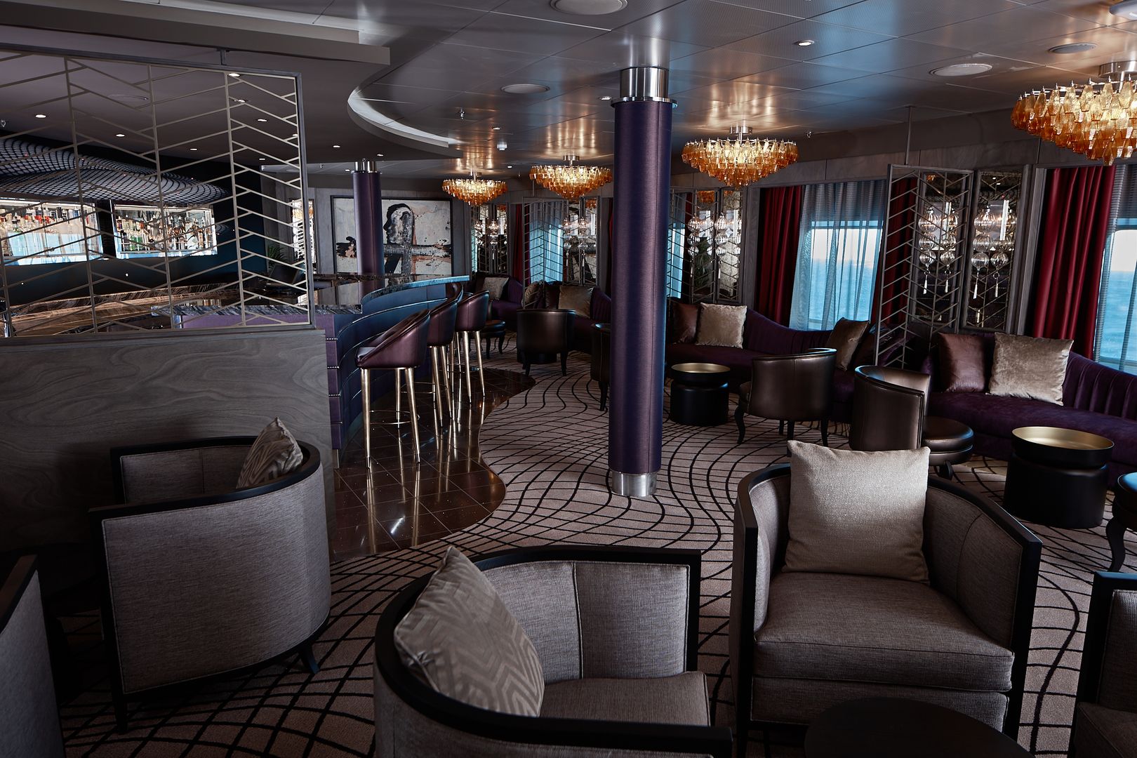 • Voyager Lounge: Das neue Design der Lounge ist inspiriert von einer modernen Interpretation des französischen Cabarets. Das zeitlos-elegante Dekor mit großen, champagnerfarbenen Kronleuchtern, die die purpurroten Sessel für Zwei entlang der übergroßen Fenster beleuchten, stellt das perfekte Ambiente für die abendliche Unterhaltung mit Live-Musik.