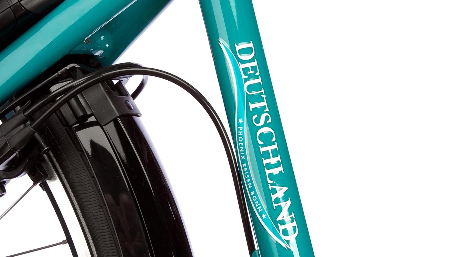 Am Rahmen steht das Schiffsname. Dieses Bike ist für die MS Deutschland. Foto: Trenga De