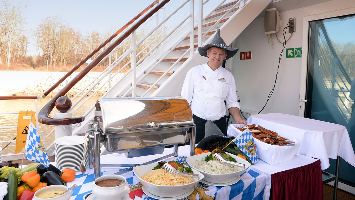 Kaum ein Reisender hält sich bei strahlendem Sonnenschein und wenig winterlichen Temperaturen um die 20 Grad im Inneren des Schiffes auf. Kein Wunder das Küchenchef Vasile Gaman mit bayrischen Spezialitäten im Außenbereich des Restaurants genau den Geschmack seiner rund 240 Passagiere an Bord trifft. Er serviert zur Einfahrt nach Wien Weißwürste mit süßem Senf, Salzbrezeln und Weizenbier.