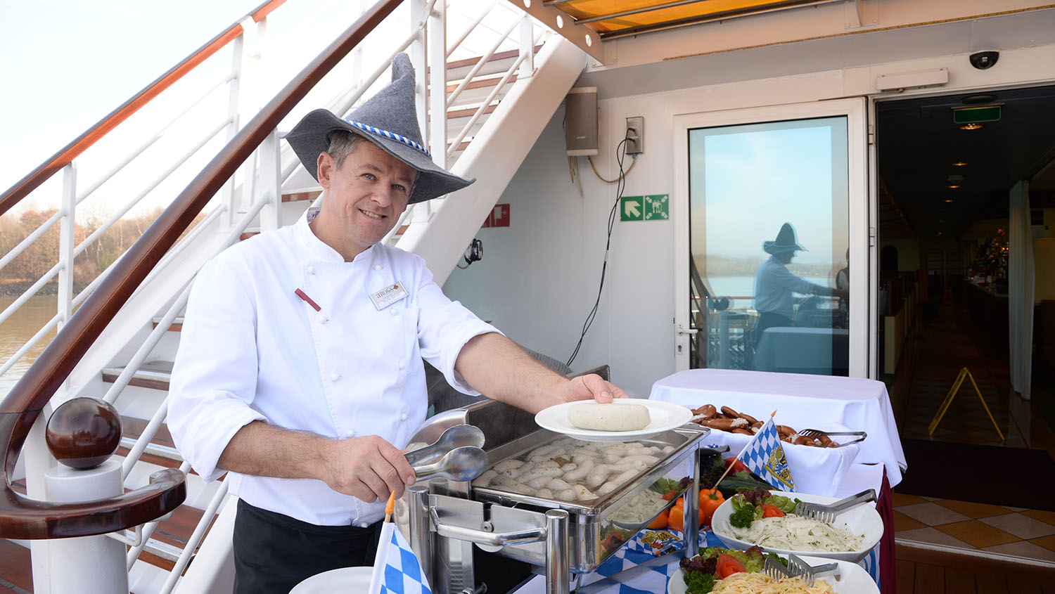 Kaum ein Reisender hält sich bei strahlendem Sonnenschein und wenig winterlichen Temperaturen um die 20 Grad im Inneren des Schiffes auf. Kein Wunder das Küchenchef Vasile Gaman mit bayrischen Spezialitäten im Außenbereich des Restaurants genau den Geschmack seiner rund 240 Passagiere an Bord trifft. Er serviert zur Einfahrt nach Wien Weißwürste mit süßem Senf, Salzbrezeln und Weizenbier.