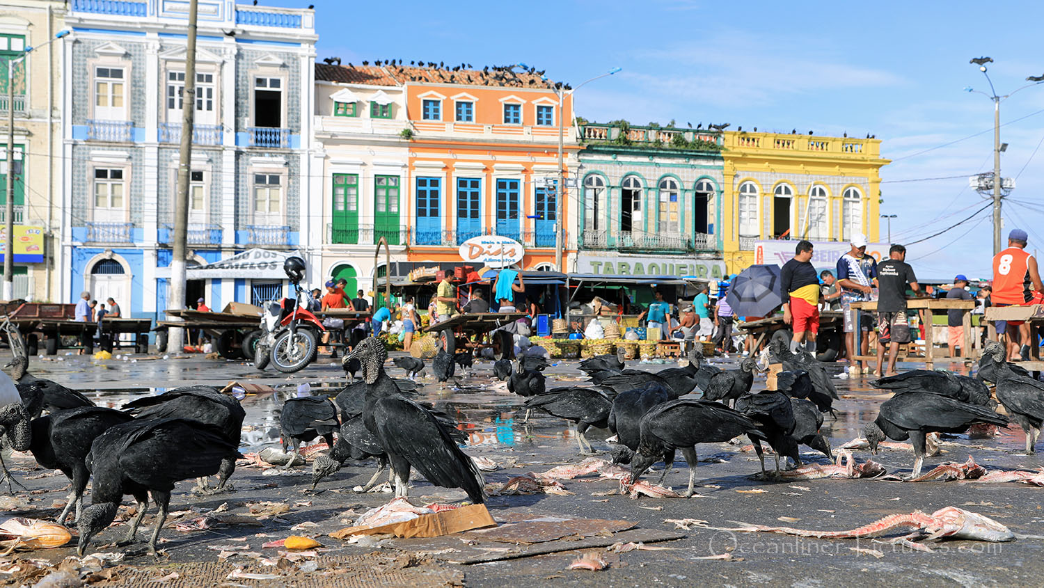 Wie zu erwarten, endet die Nacht – bedingt durch die Zeitverschiebung von 5 Stunden – relativ früh. Die perfekte Gelegenheit für meinen zweiten Besuch auf dem Ver-o-Peso Markt. Das quirlige Treiben im kleinen Fischerhafen sowie in den angrenzenden Fischhallen ist am frühen Morgen besonders faszinierend. Unzählige Rabengeier kreisen über den hölzernen Fischerbooten und liefern sich einen unerbittlichen Kampf um die Fischreste, die von den Fischern ans Ufer geworfen werden. Im Sekundentakt werden die Fische an die Marktbesucher herausgegeben, manchmal einzeln und manchmal in ganzen Kisten. Um 11:30 Uhr endet mein Morgenspaziergang durch Belém. Es folgt die obligatorische Seenotrettungsübung an Bord der MS Hamburg und um 12:00 Uhr heißt es „Leinen los“ zu spannenden Destinationen zwischen Belém und Havanna.