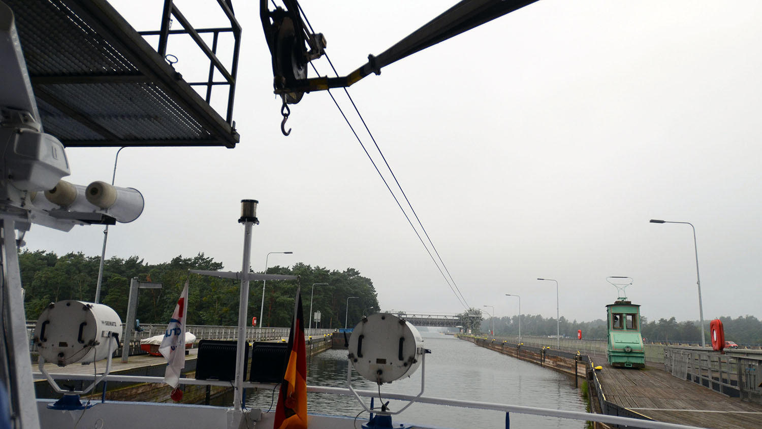 Am nächsten Morgen stehen wir, als ich aufstehe, schon vor meinem persönlichen Highlight der Reise. Langsam nähert sich die 83 Meter lange Katharina von Bora dem Schiffshebewerk in Niederfinow.