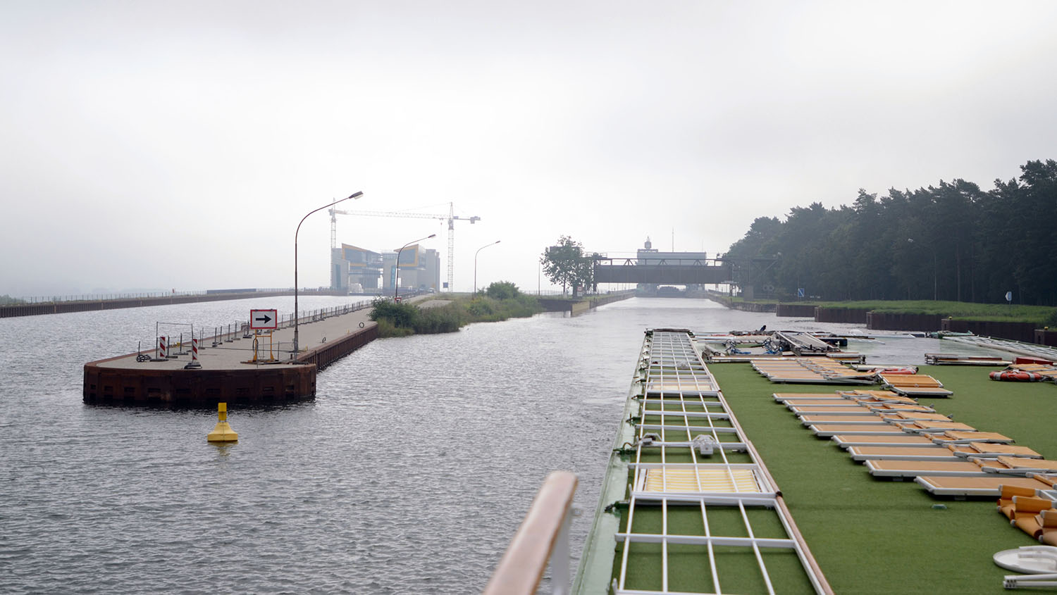 Am nächsten Morgen stehen wir, als ich aufstehe, schon vor meinem persönlichen Highlight der Reise. Langsam nähert sich die 83 Meter lange Katharina von Bora dem Schiffshebewerk in Niederfinow.