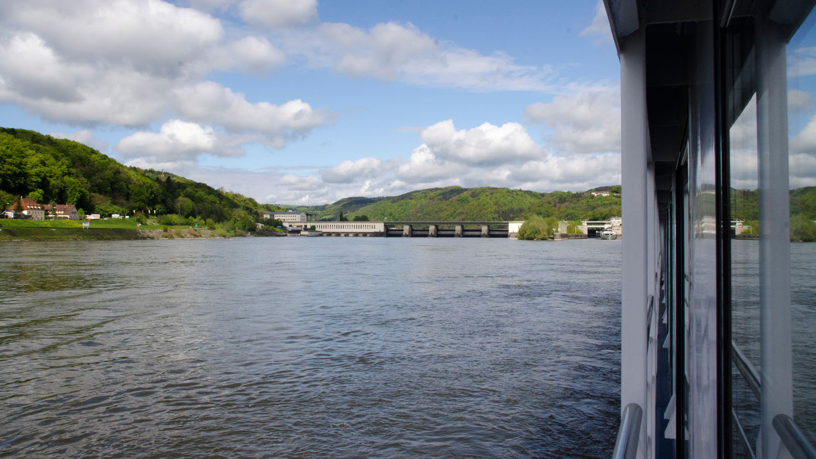 Die erste Nacht an Bord war traumhaft, zeitig bin ich am ersten Tag, nach der anstrengenden Anreise nach Passau, schon früh ins Bett gegangen und total entspannt am Morgen aufgewacht. Der erste Schritt aus dem Bett führte mich direkt zum Fenster, ich öffnete den Vorhang und erblickte am französischen Balkon eine umwerfende Landschaft an der Donau, alles im frischen Grün und vom weiten sah ich schon das niederösterreichische Donaukraftwerk Wallsee-Mitterkirchen. Bereits in der Nacht haben wir die ersten Schleusen durchfahren, da ich aber so gut schlief habe ich nicht eine Schleuse auf dem Weg mitbekommen.