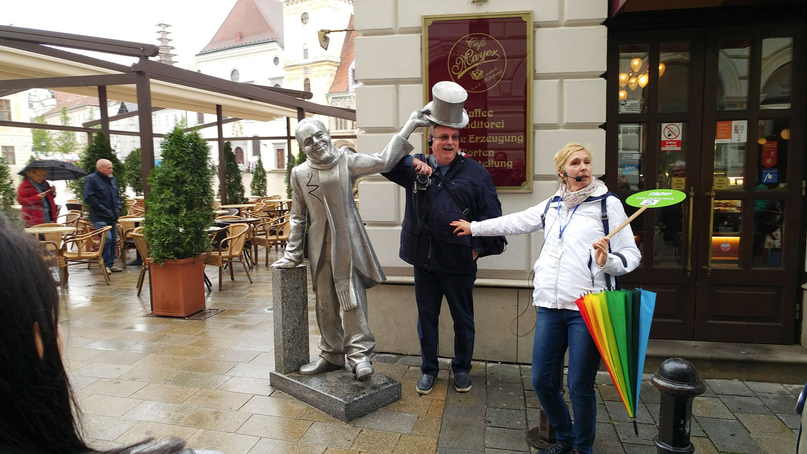 Das tolle Programm am Vormittag verging viel zu schnell, schon am Mittag machten wir in Bratislava fest und starteten bei leichten Regen unseren Ausflug Stadtrundfahrt Bratislava mit Kunstgalerie. Wie auch bisher meinte es das Wetter wieder gut mit uns und kurz nachdem wir starteten hörte es auf zu regnen. Nun ging es in die Altstadt von Bratislava, nicht nur historische Architektur ist in der Stadt zu finden, sondern auch viele moderne Einflüsse. Das aus drei Gebäuden gebildete Alte Rathaus aus dem 14. Jahrhundert ist eines der ältesten erhaltenen Häuser der Stadt und gehört zu den sehenswertesten Gebäuden. Vom hier zentral gelegenen Hauptplatz, der von zahlreichen Palais` und Bürgerhäusern umgeben ist, kamen wir zum barocken Michaelertor.