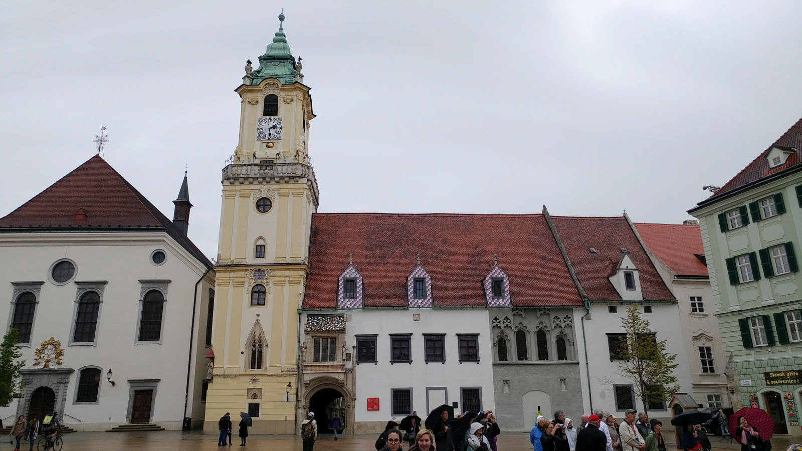 Das tolle Programm am Vormittag verging viel zu schnell, schon am Mittag machten wir in Bratislava fest und starteten bei leichten Regen unseren Ausflug Stadtrundfahrt Bratislava mit Kunstgalerie. Wie auch bisher meinte es das Wetter wieder gut mit uns und kurz nachdem wir starteten hörte es auf zu regnen. Nun ging es in die Altstadt von Bratislava, nicht nur historische Architektur ist in der Stadt zu finden, sondern auch viele moderne Einflüsse. Das aus drei Gebäuden gebildete Alte Rathaus aus dem 14. Jahrhundert ist eines der ältesten erhaltenen Häuser der Stadt und gehört zu den sehenswertesten Gebäuden. Vom hier zentral gelegenen Hauptplatz, der von zahlreichen Palais` und Bürgerhäusern umgeben ist, kamen wir zum barocken Michaelertor.