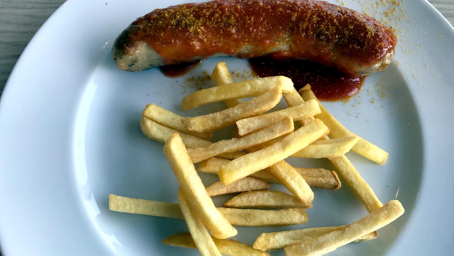 Currywurst und Pommes im Tag & Nacht Bistro. Foto: lenthe/touristik-foto.de