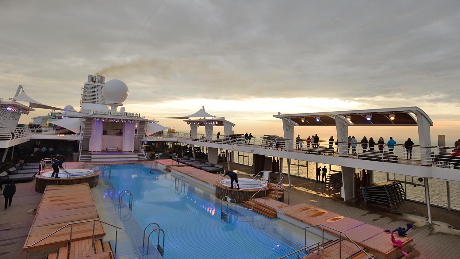 Um 19 Uhr hieß es dann endlich „Leinen los“. Zunächst versammelten sich die Passagiere auf dem Sonnendeck, um das Auslaufen aus dem Hafen bei der Flottenhymne „Die große Freiheit“ zu genießen. Der Regen hatte sich rechtzeitig verzogen und kurze Zeit später stellten sich auch schon die Offiziere beim Empfang „Willkommen an Bord“ auf der Bühne am Pooldeck vor. Cruise Director Stephan Zimmermann führte mit seinen stimmungsvollen Sprüchen kurzweilig durchs Programm. Hier wurde aber deutlich, dass die Mein Schiff 6 eigentlich für sommerliche Gefilde gebaut wurde. Kurz vor der Präsentation der Besatzung rauschte der gesammelte Regen vom Nachmittag in Wasserfällen von den Sonnensegeln auf die Bühne. Glück gehabt, dass die Show noch nicht begonnen hatte.