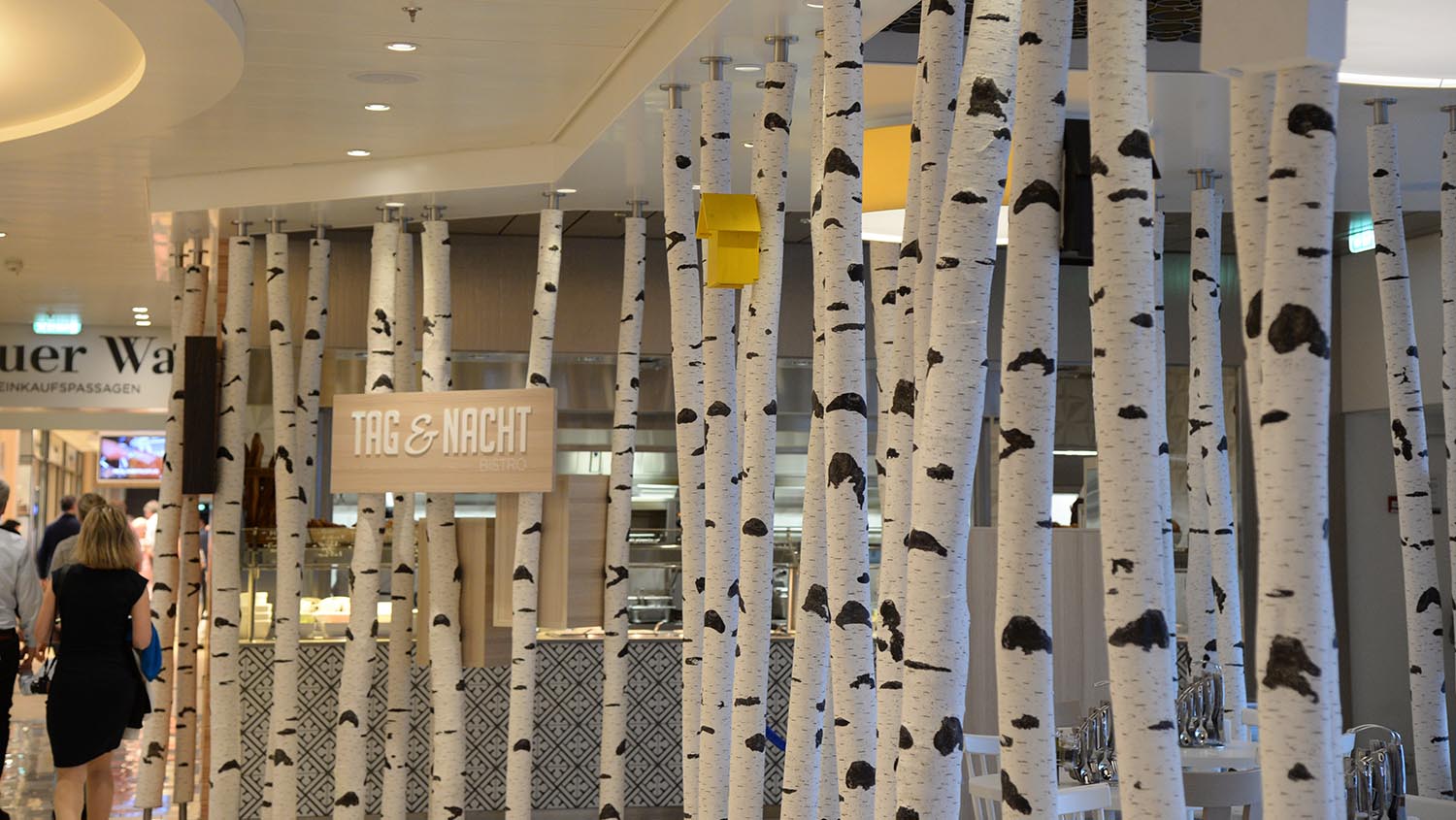 Auf geht es zum ersten Schiffsrundgang. Zunächst schauen wir uns in der Diamantbar sowie der Großen Freiheit um und natürlich die neugestaltete Schau Bar auf Deck 5. Während in der Diamantbar und der Großen Freiheit alles wie gewohnt ist, hat sich in der Schau Bar einiges verändert. Dezent, aber geschmackvoll ist die Gestaltung des Jazzclubs gelungen. Weiter geht es auf dem Neuen Wall, dessen Geschäfte und die Fotogalerie zu diesem frühen Zeitpunkt im Hafen natürlich noch geschlossen sind. Hier wird auf dem ersten Blick eins klar: Am Raumkonzept wurde viel getüftelt. Es gibt nun Ruhezonen mit Sesseln, in dem Frauen ihre gestressten Männer bei der Shoppingtour parken können und es gibt einen Kaffeeautomaten, der zusätzlich zum längeren verweilen in diesem Bereich einlädt.