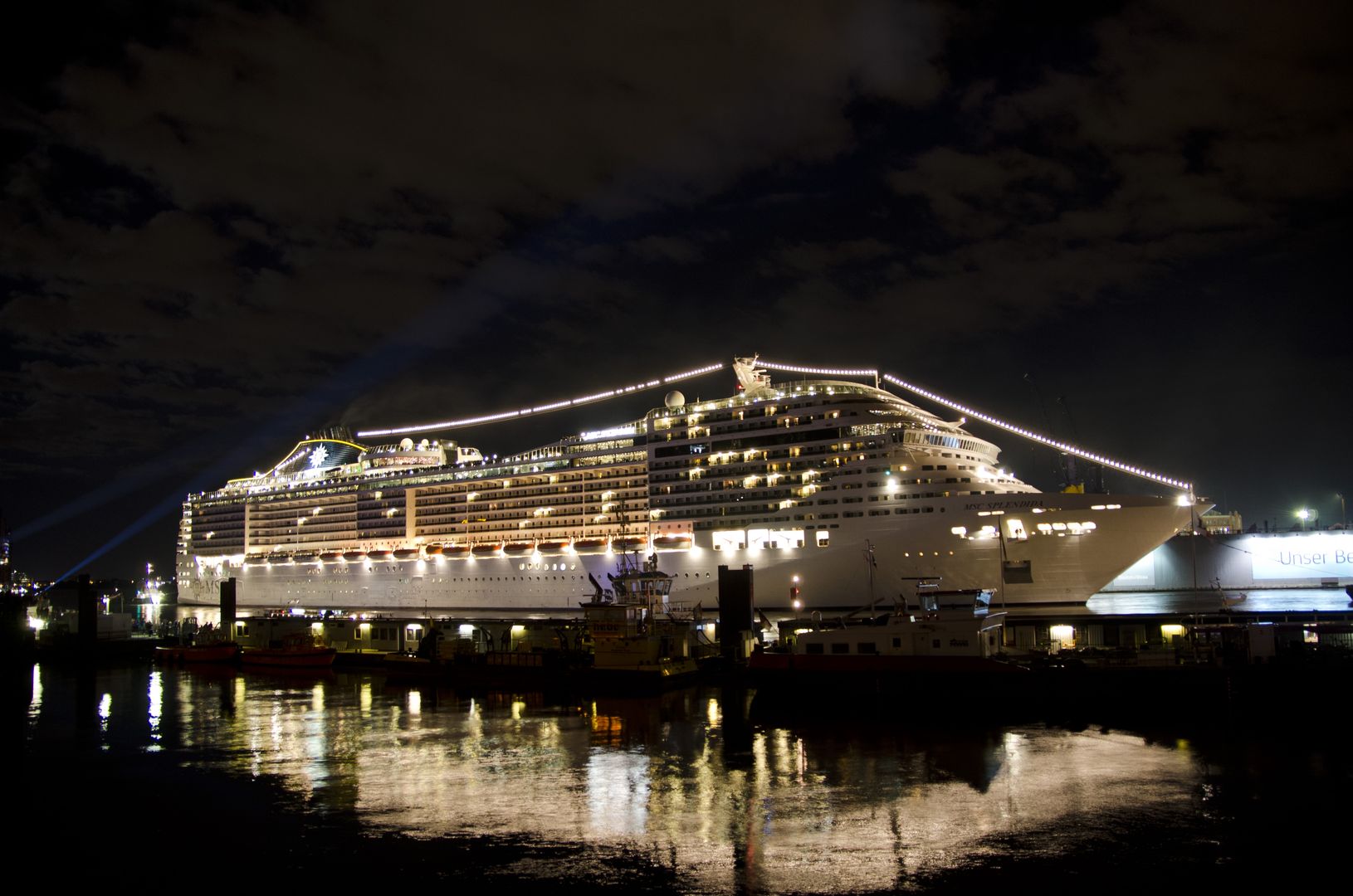 Ein fulminantes Schiffshornkonzert mit einem Medley aus internationalen und Hamburger Songs in Kombination mit einer spektakulären Lichtinstallation des Hamburger Künstlers Michael Batz sorgten ebenso für Gänsehautstimmung bei den zahlreichen Gästen, wie das gigantische Feuerwerk zum krönenden Abschluss. Bis in die späten Abendstunden feierten die Hamburger gemeinsam mit der Reederei den 100. Anlauf eines MSC Kreuzfahrtschiffes.