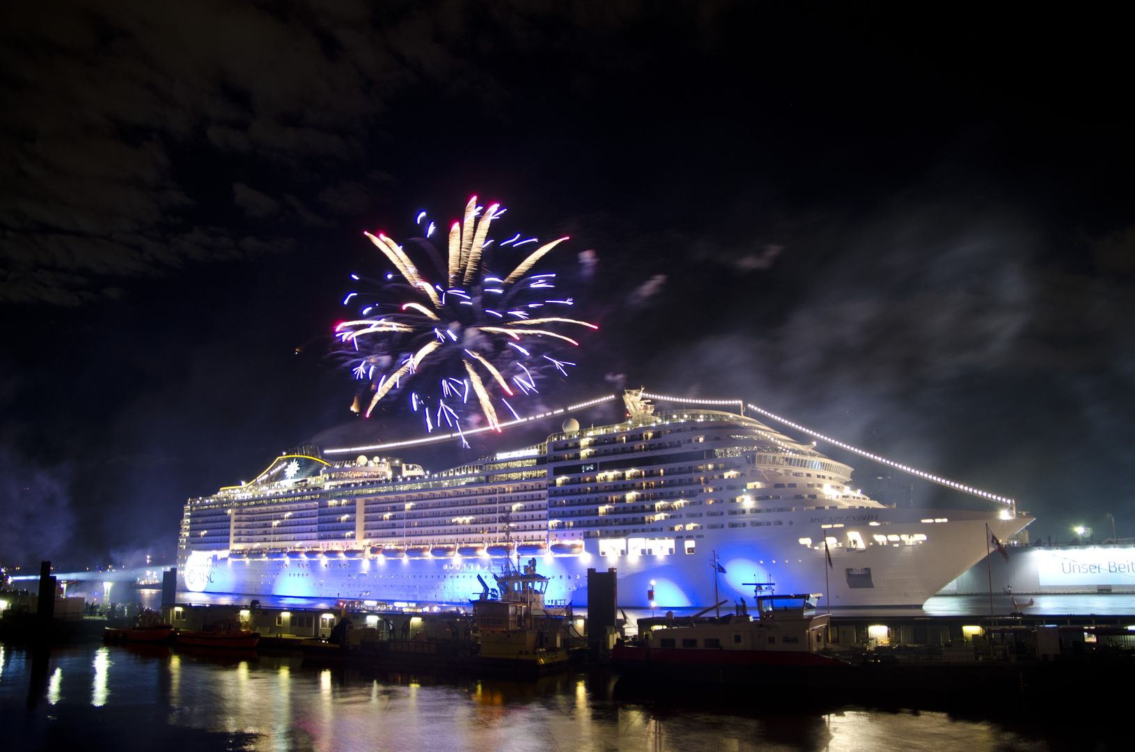 Feuerwerk zum 100. Anlauf eines MSC Kreuzfahrtschiffes in Hamburg. Foto: bergeest