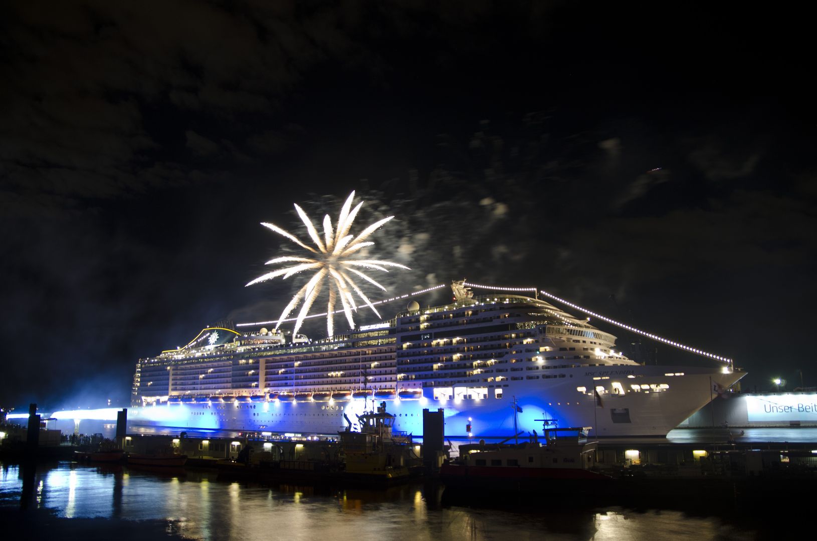 Feuerwerk zum 100. Anlauf eines MSC Kreuzfahrtschiffes in Hamburg. Foto: bergeest