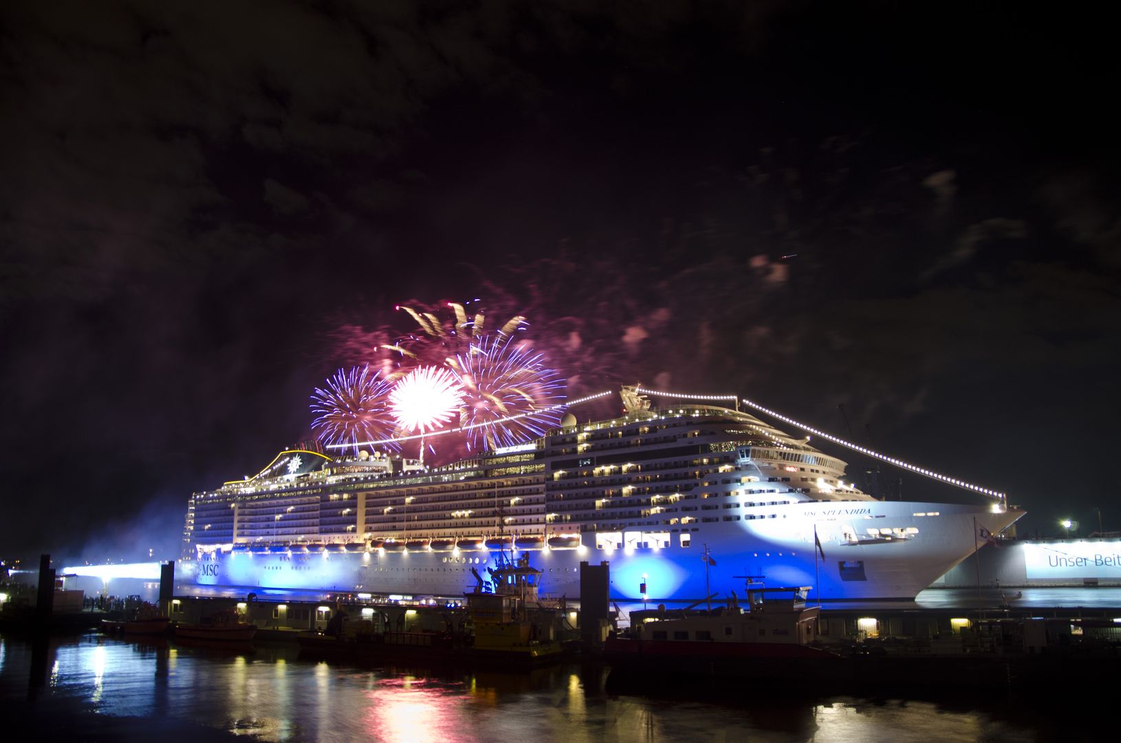 Feuerwerk zum 100. Anlauf eines MSC Kreuzfahrtschiffes in Hamburg. Foto: bergeest
