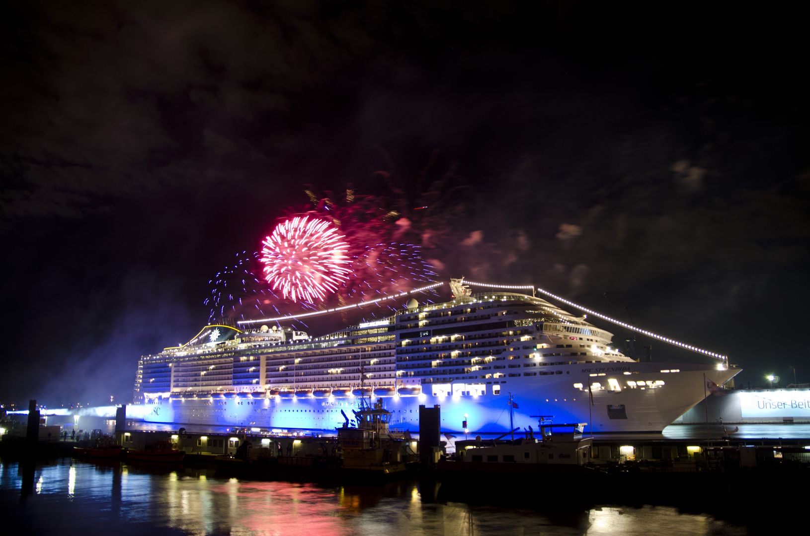 Feuerwerk zum 100. Anlauf eines MSC Kreuzfahrtschiffes in Hamburg. Foto: bergeest